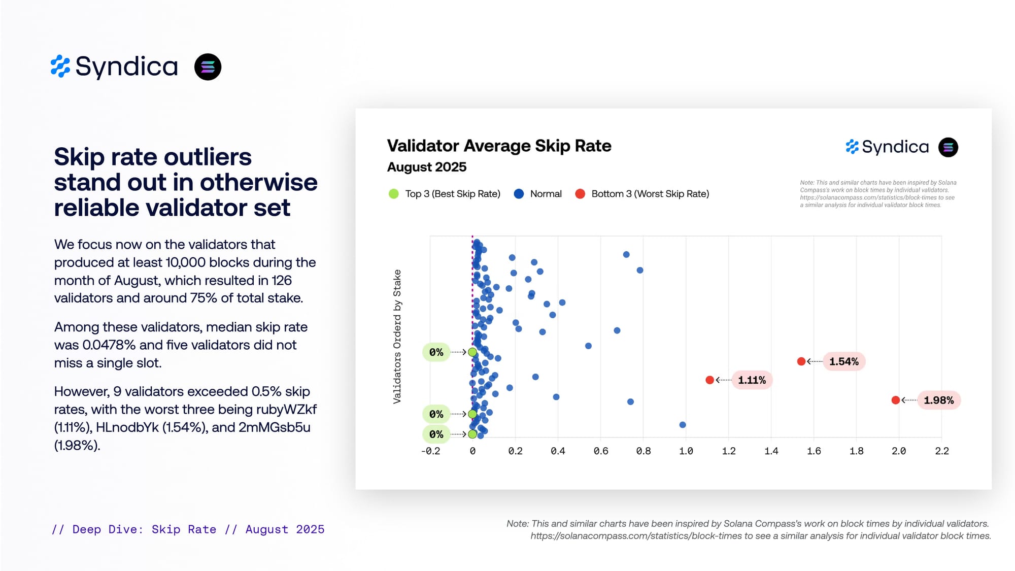 We focus now on the validators that produced at least 10,000 blocks during the month of August, which resulted in 126 validators and around 75% of total stake. Among these validators, median skip rate was 0.0478% and five validators did not miss a single slot. However, 9 validators exceeded 0.5% skip rates, with the worst three being rubyWZkf (1.11%), HLnodbYk (1.54%), and 2mMGsb5u (1.98%).