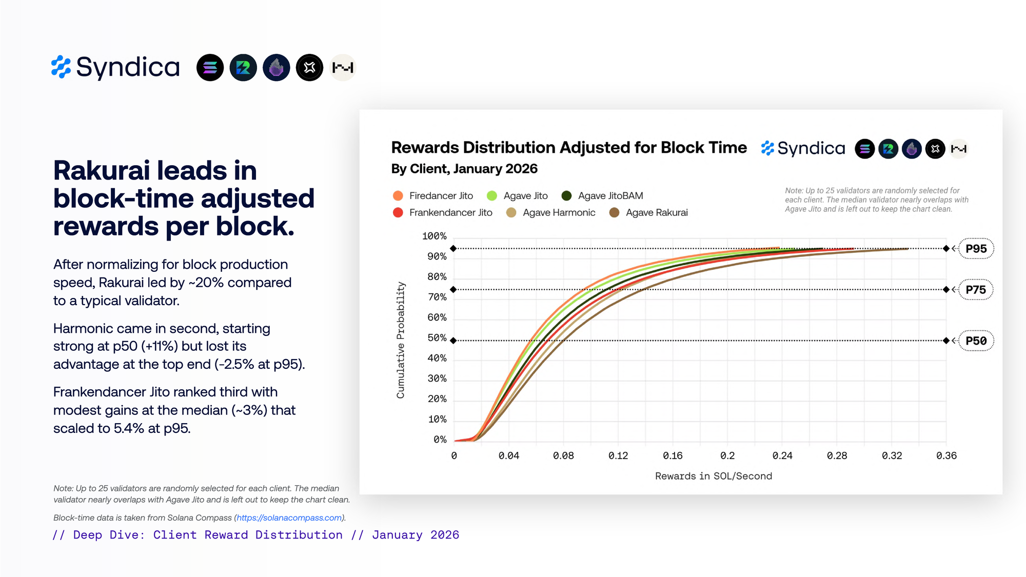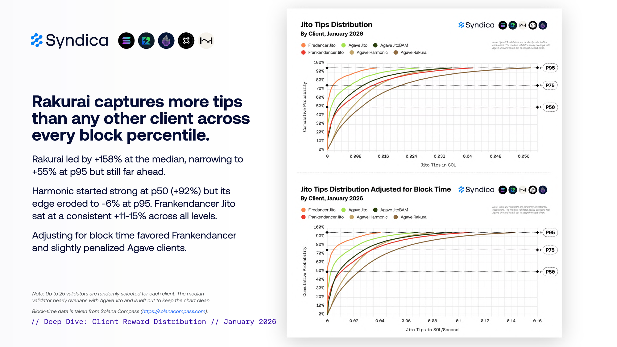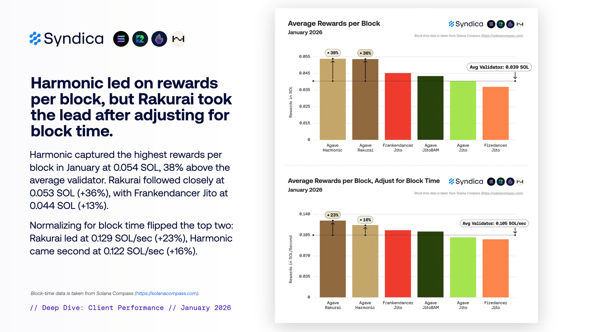 Harmonic captured the highest rewards per block in January at 0.054 SOL (38% above the average validator). Rakurai followed at 0.053 SOL (+36%), with Frankendancer Jito at 0.044 SOL (+13%).