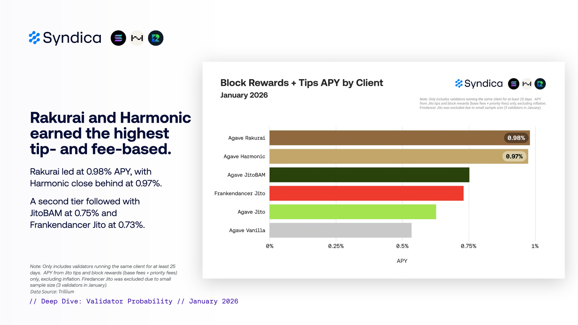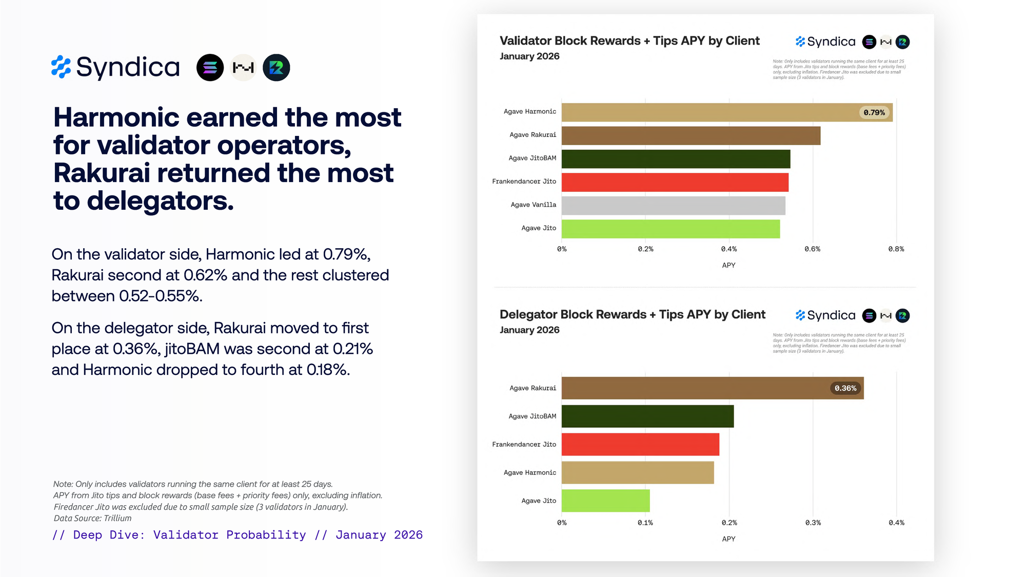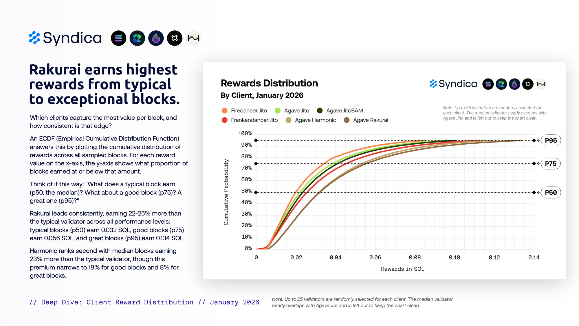 Harmonic captured the highest rewards per block in January at 0.054 SOL (38% above the average validator). Rakurai followed at 0.053 SOL (+36%), with Frankendancer Jito at 0.044 SOL (+13%).