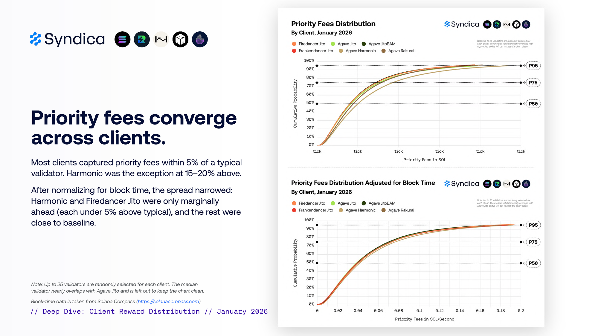 Most clients captured priority fees within 5% of a typical validator. Harmonic was the exception at 15–20% above.