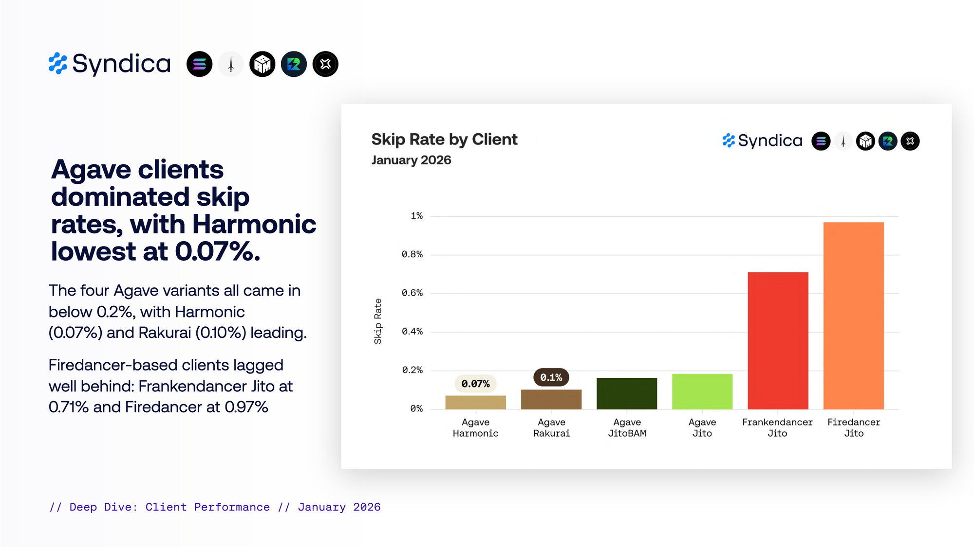 Agave clients dominated skip rates, with Harmonic lowest at 0.07%.