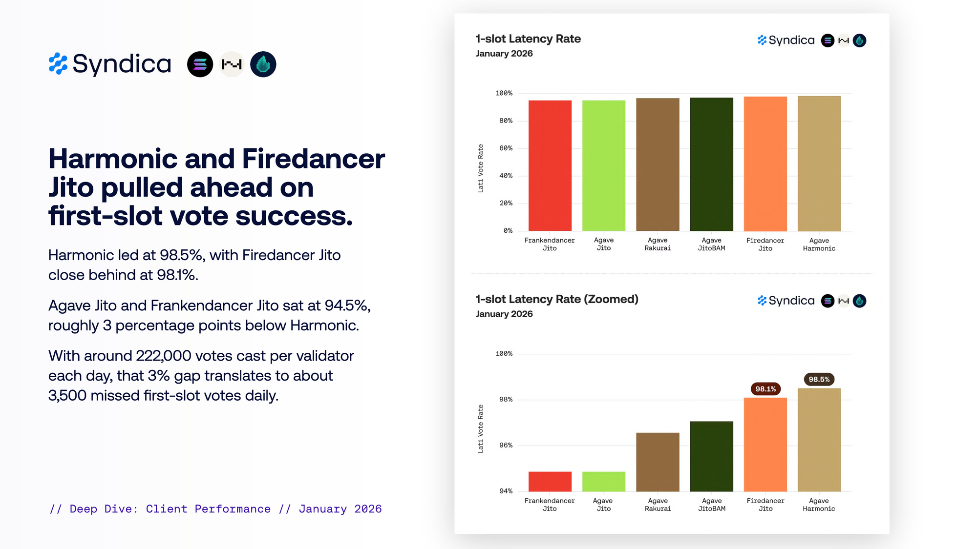 Harmonic and Firedancer Jito pulled ahead on first-slot vote success.