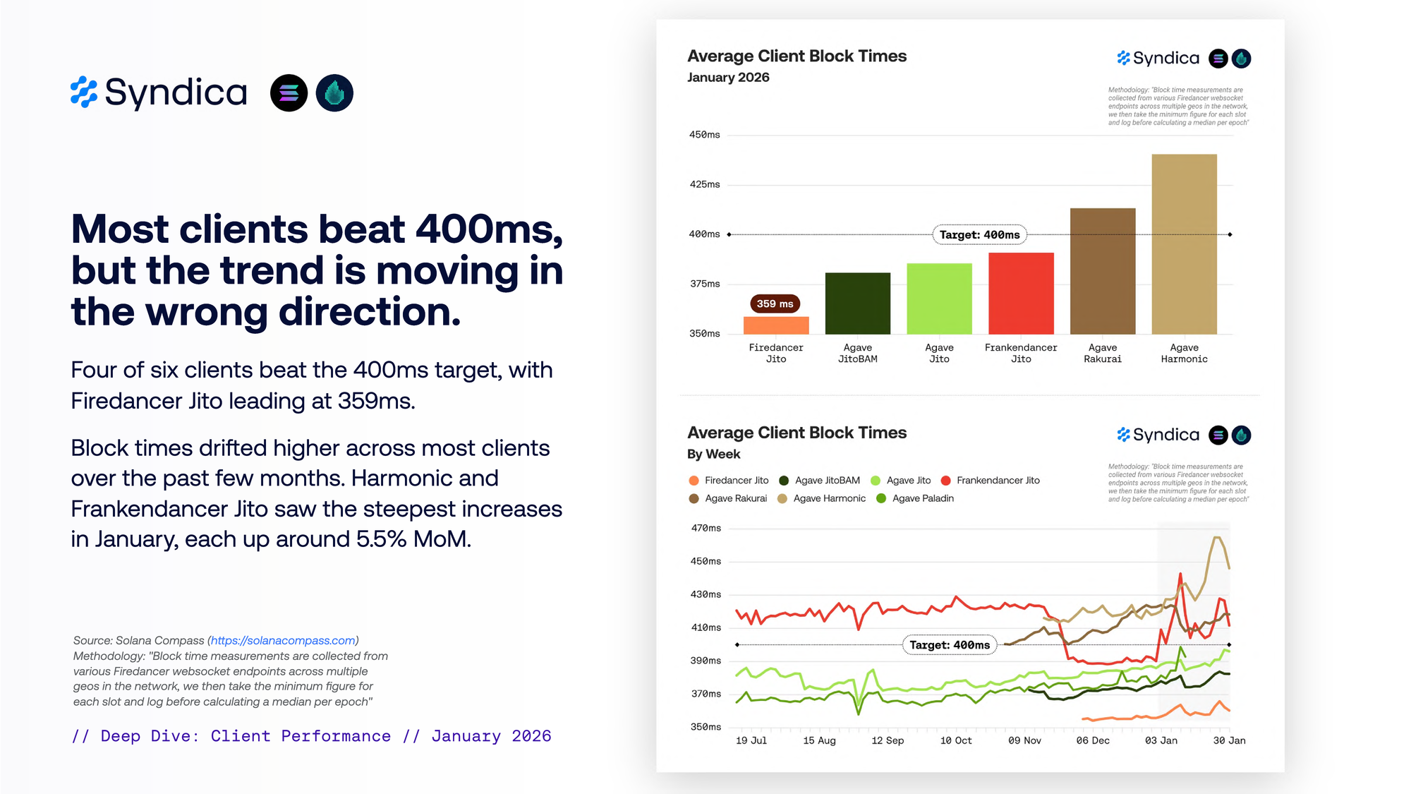 Four of six clients beat the 400ms target, with Firedancer Jito leading at 359ms.
