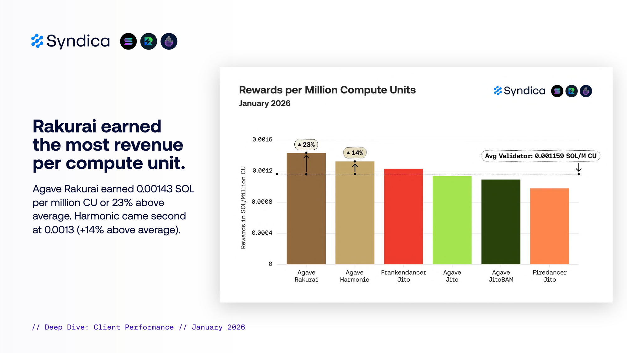 Agave Rakurai earned 0.00143 SOL per million CU (23% above average). Harmonic came second at 0.0013 SOL (+14% above average).