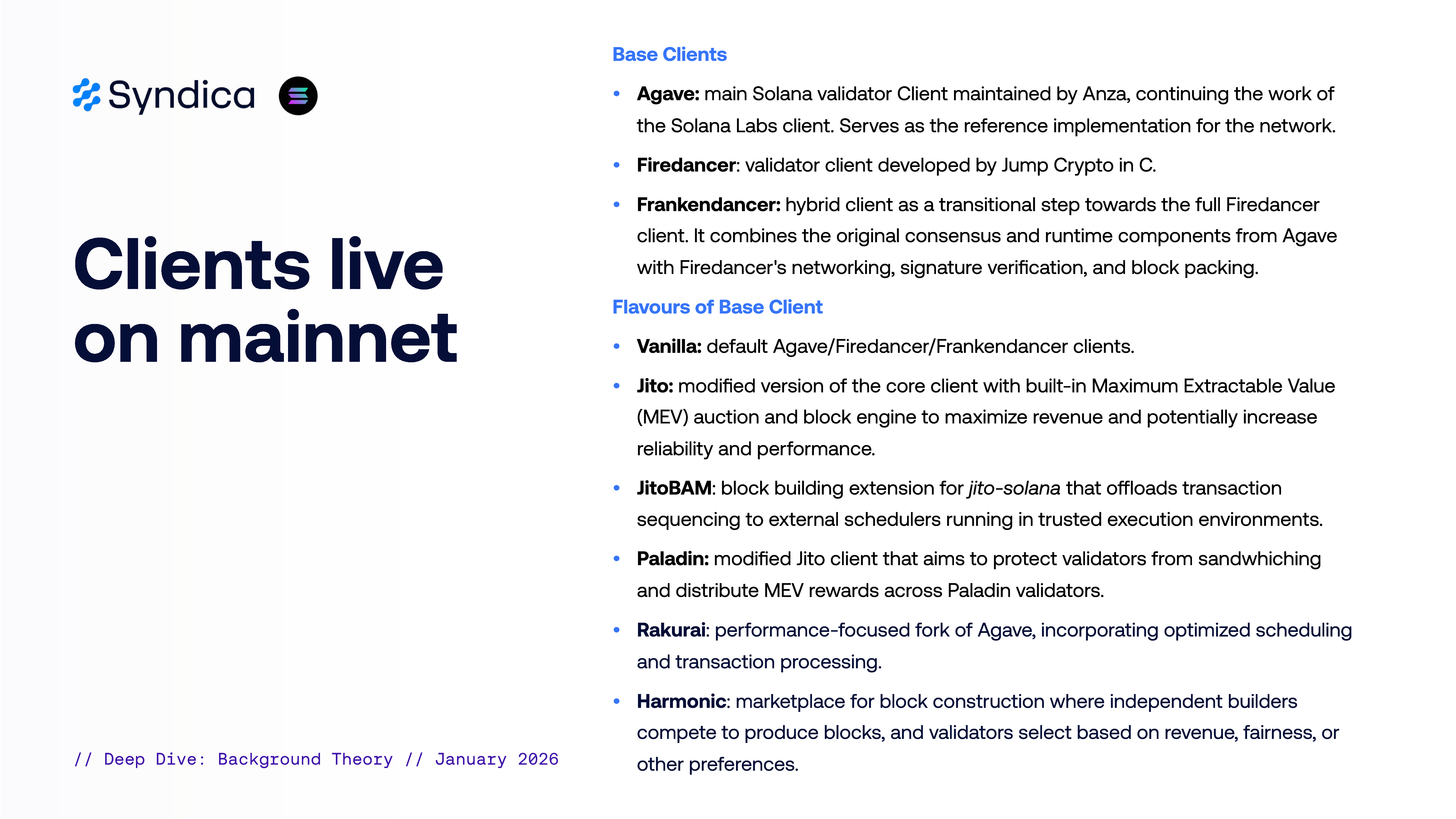 Jito: Modified client with built-in MEV auction and block engine.