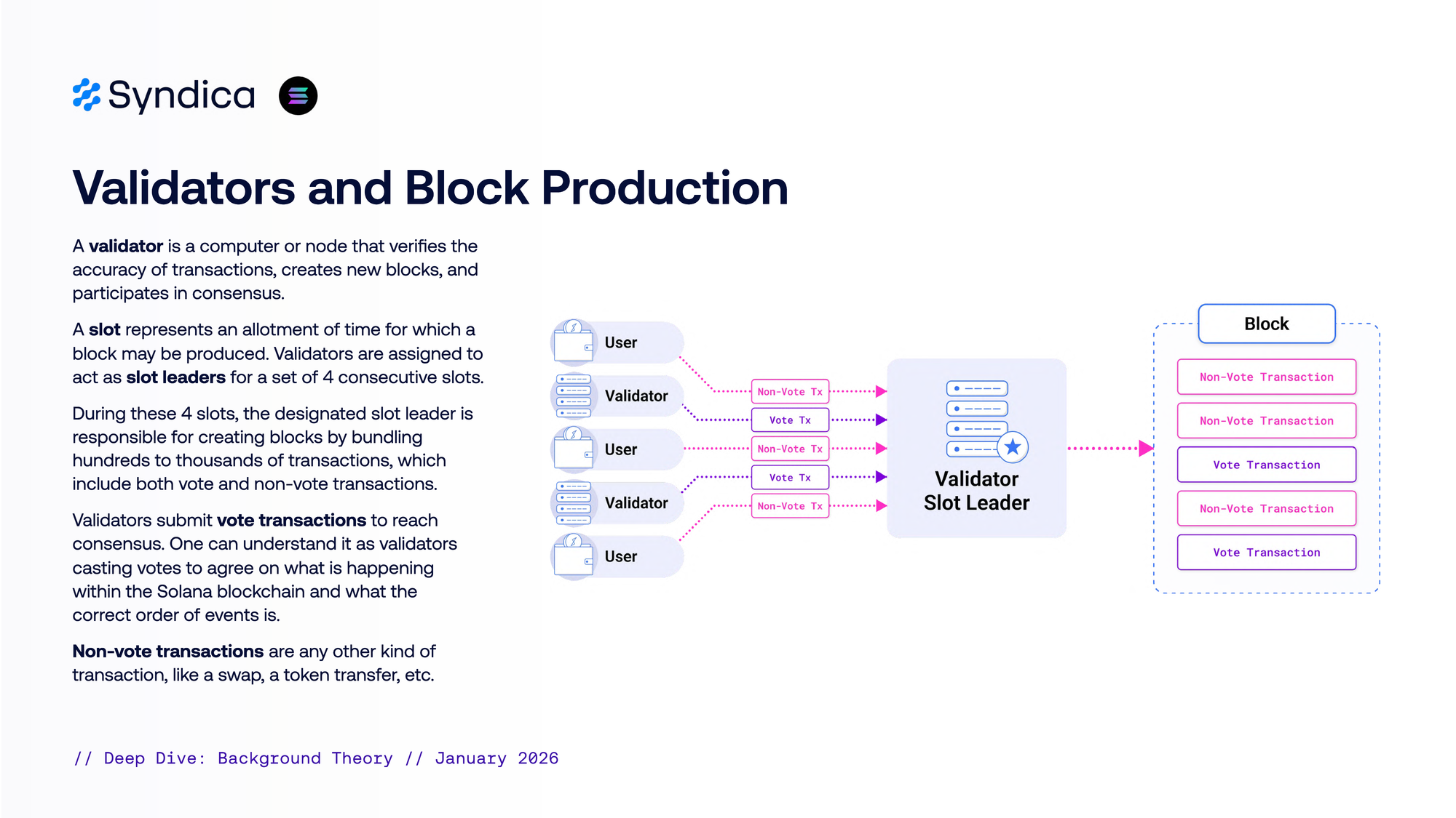 A slot represents a time allotment during which a block may be produced. Validators act as slot leaders for four consecutive slots. During these slots, they bundle hundreds to thousands of vote and non-vote transactions.