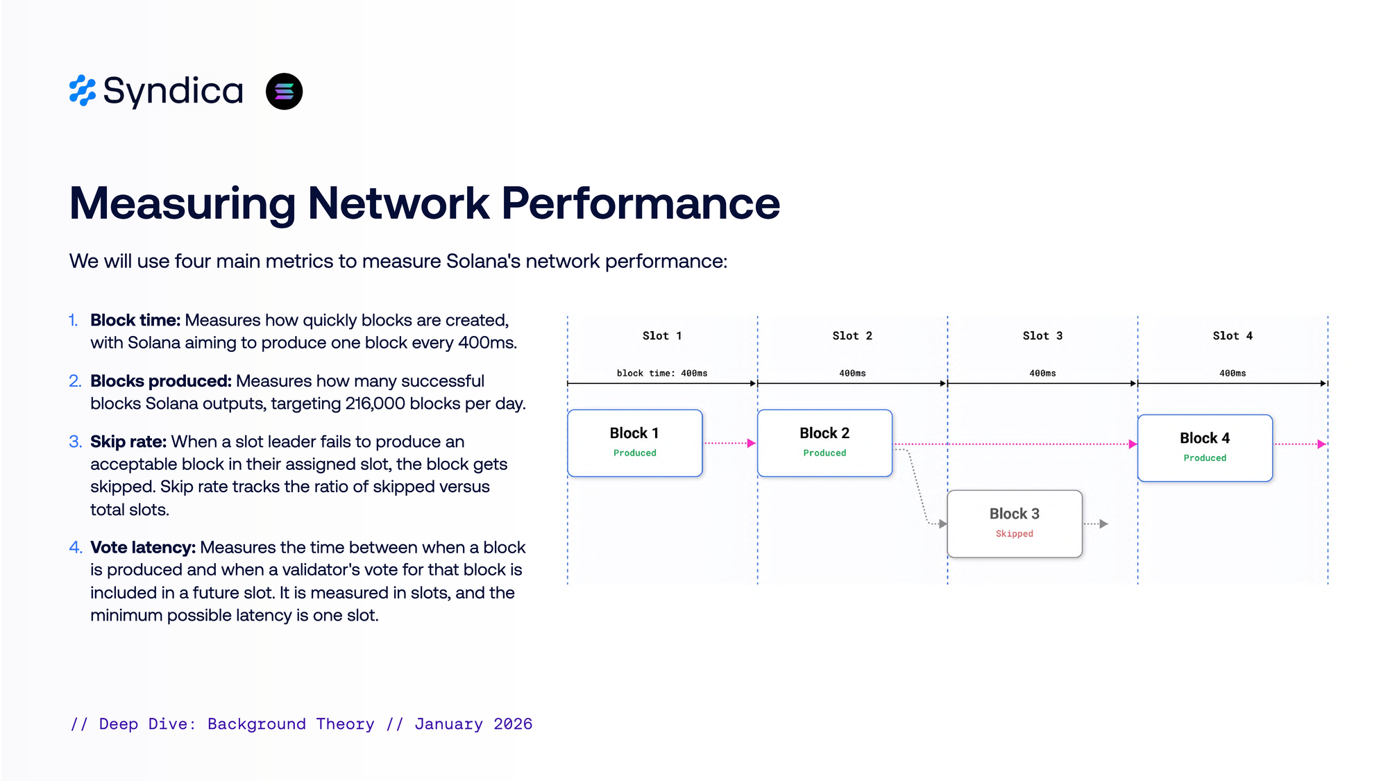- Vote latency — Time between block production and vote inclusion