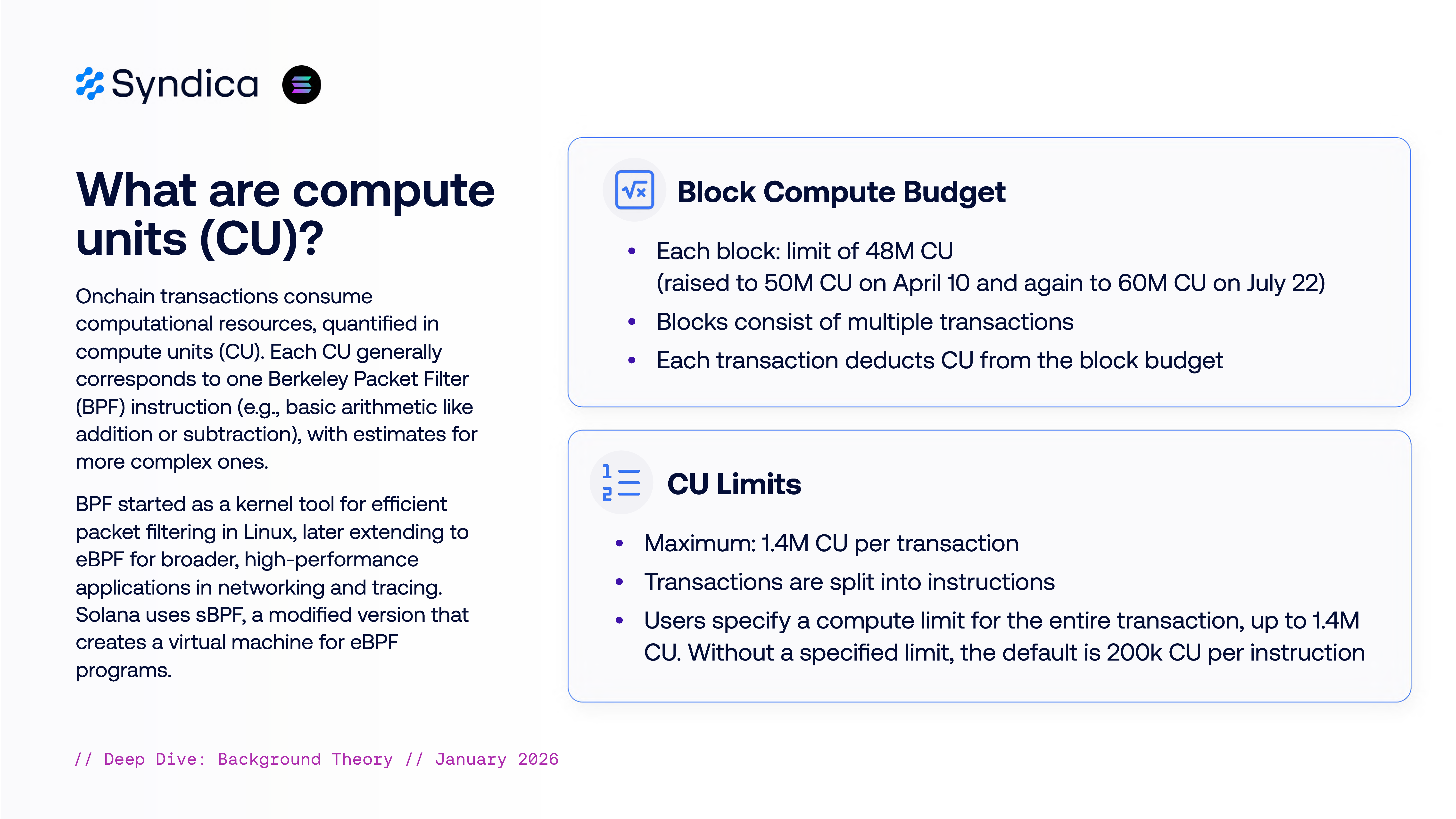 Compute Units represent computational resources consumed by transactions. Each CU roughly corresponds to one Berkeley Packet Filter (BPF) instruction.