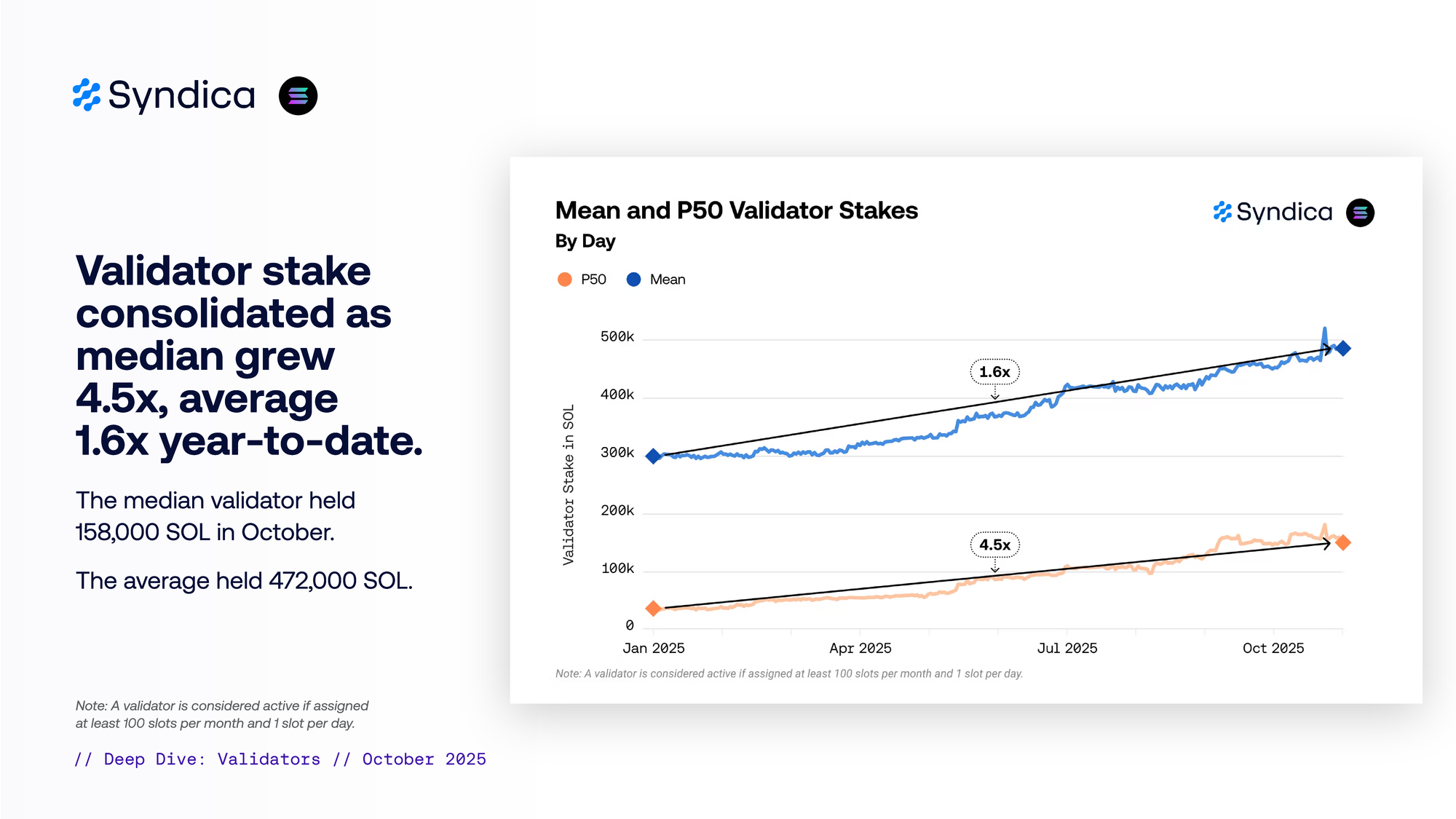 Validator stake consolidated as median grew 4.5x, average 1.6x year-to-date. The median validator held 158,000 SOL in October. The average held 472,000 SOL.