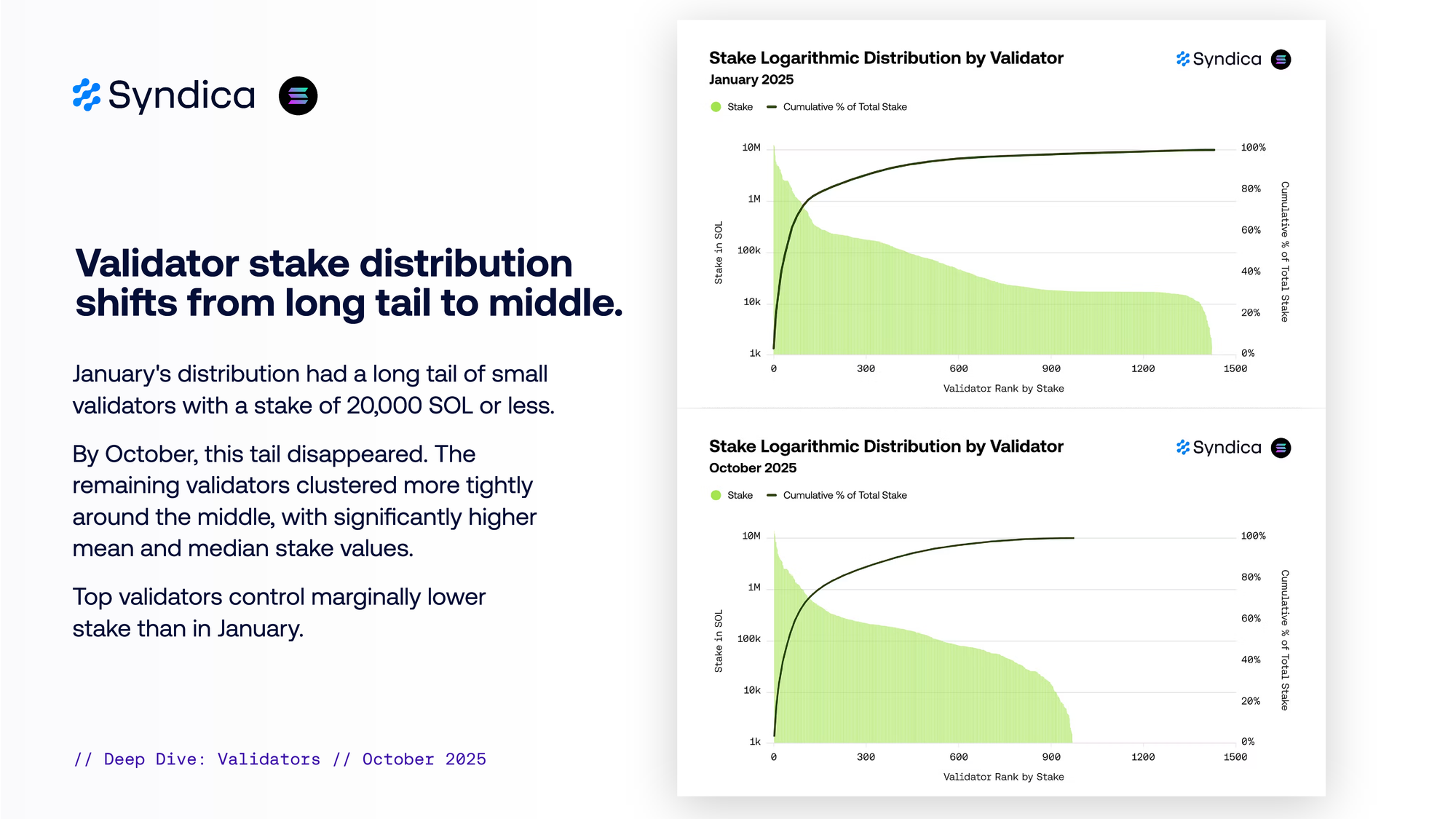 Validator stake distribution shifts from long tail to middle. January's distribution had a long tail of small validators with a stake of 20,000 SOL or less. By October, this tail disappeared. The remaining validators cluster more tightly around the middle, with significantly higher mean and median stake values. Top validators controlled marginally lower stake than in January.