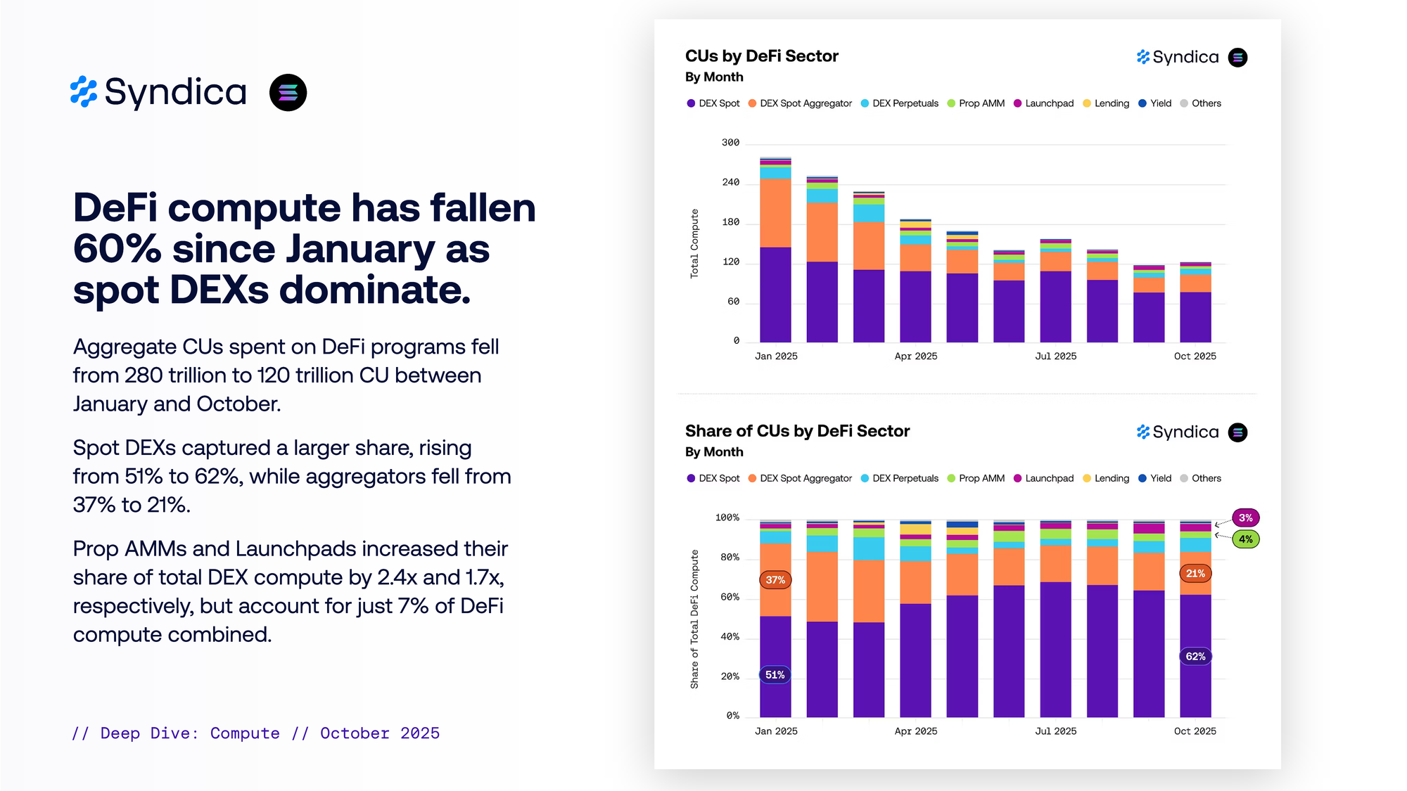 DeFi compute has fallen 60% since January as spot DEXs dominate. Aggregate CUs spent on DeFi programs fell from 280 trillion to 120 trillion CU between January and October. Spot DEXs captured a larger share, rising from 51% to 62%, while aggregators fell from 37% to 21%. Prop AMMs and Launchpads increased their share of total DEX compute by 2.4x and 1.7x, respectively, but account for just 7% of DeFi compute combined.