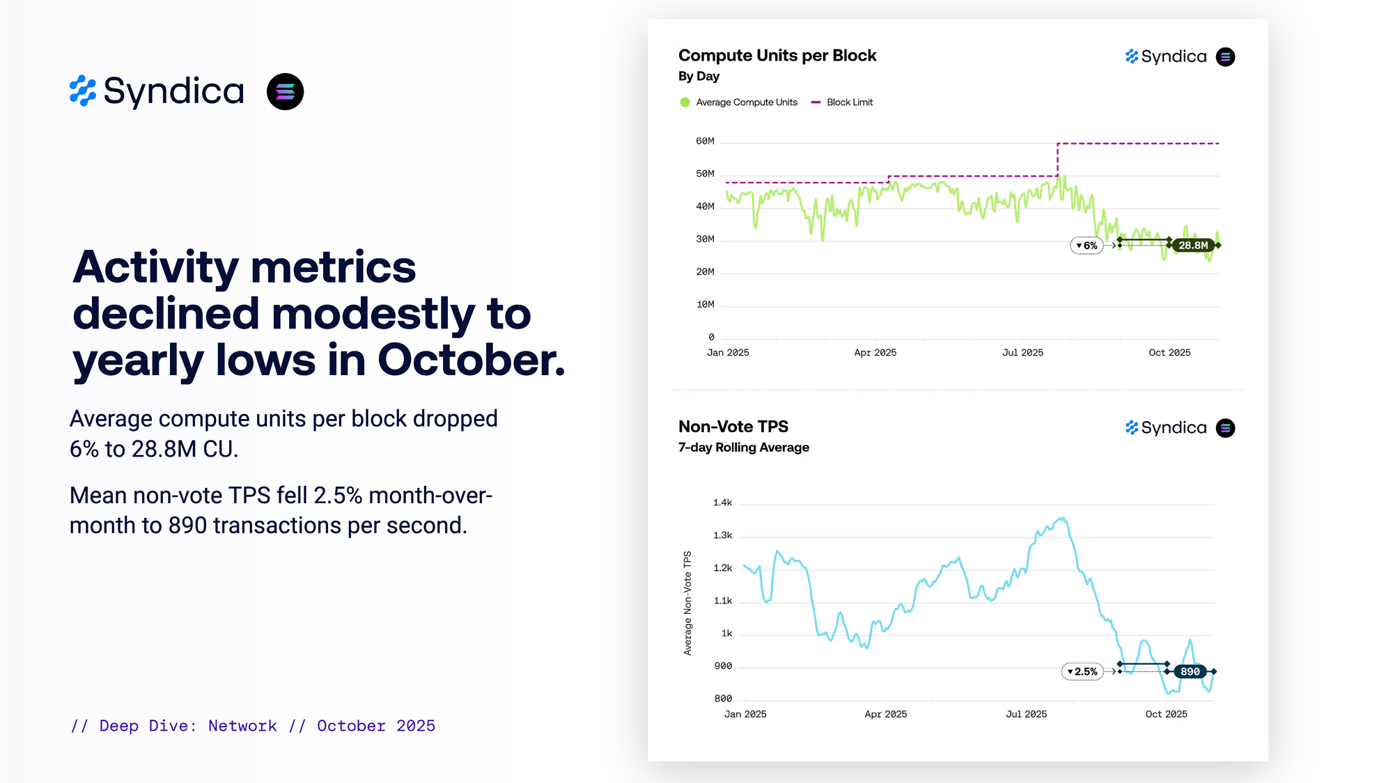 Activity metrics declined modestly to yearly lows in October. Average compute units per block dropped 6% to 28.8M CU. Mean non-vote TPS fell 2.5% month-over-month to 890 transactions per second.