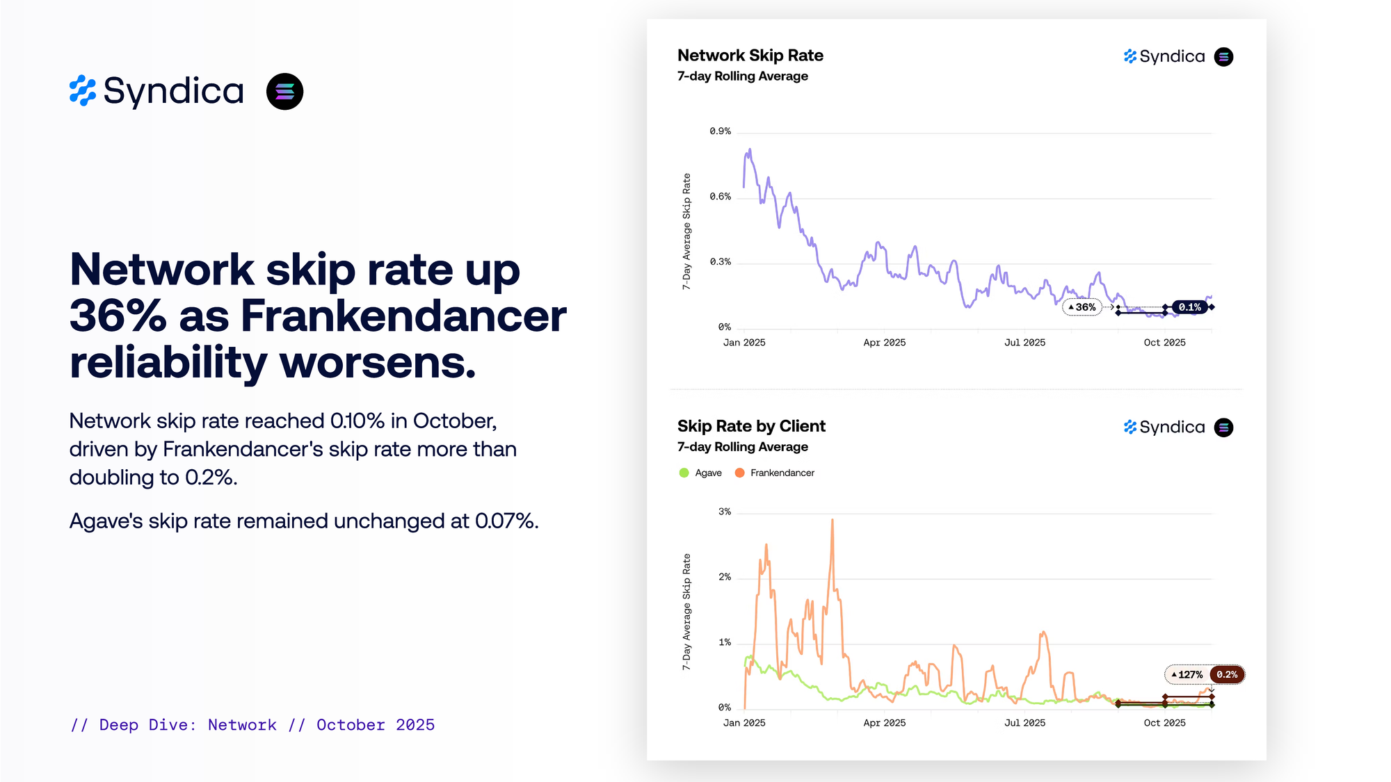 Network skip rate up 36% as Frankendancer reliability worsened. Network skip rate reached 0.10% in October, driven by Frankendancer's skip rate more than doubling to 0.2%. Agave's skip rate remained unchanged at 0.07%.