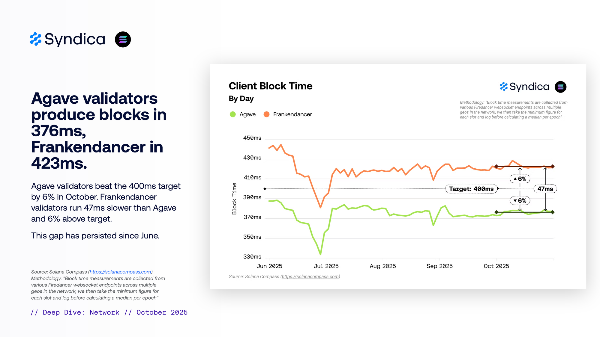 Agave validators produced blocks in 376ms, Frankendancer in 423ms. Agave validators beat the 400ms target by 6% in October. Frankendancer validators ran 47ms slower than Agave and 6% above target. This gap has persisted since June.