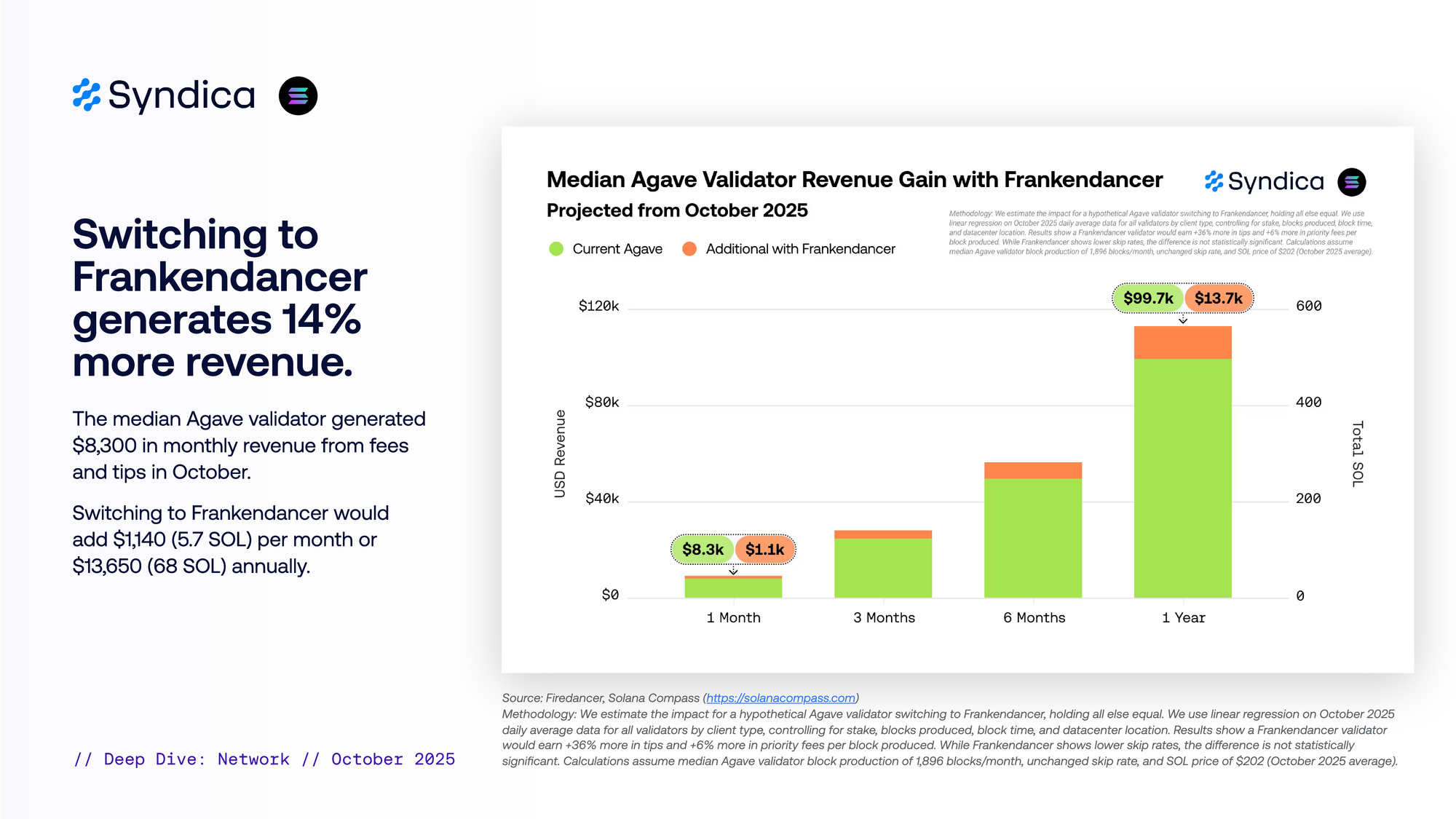 Switching to Frankendancer generated 14% more revenue. The median Agave validator generated $8,300 in monthly revenue from fees and tips in October. Switching to Frankendancer would add $1,140 (5.7 SOL) per month or $13,650 (68 SOL) annually.