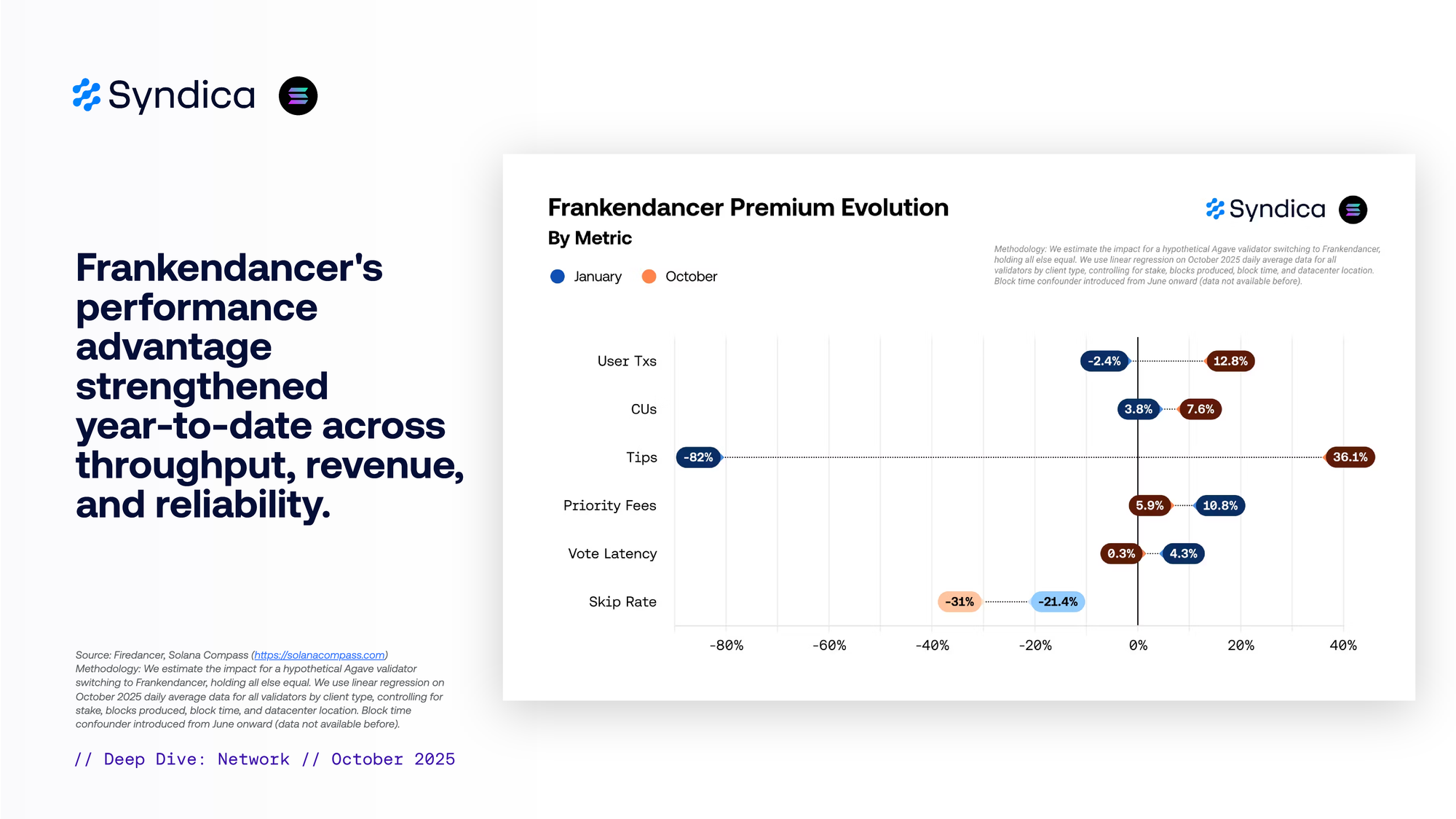 Frankendancer delivers higher throughput and revenue with no reliability cost. By October 2025, Frankendancer validators processed 13% more non-vote transactions, pack blocks with 8% more CUs, and earn 36% more in tips, and 6% more in priority fees per block than Agave. These throughput and revenue gains come at very little cost to reliability: vote latency differs by just 0.3%, and skip rate differences are not statistically significant after controlling for confounders.
