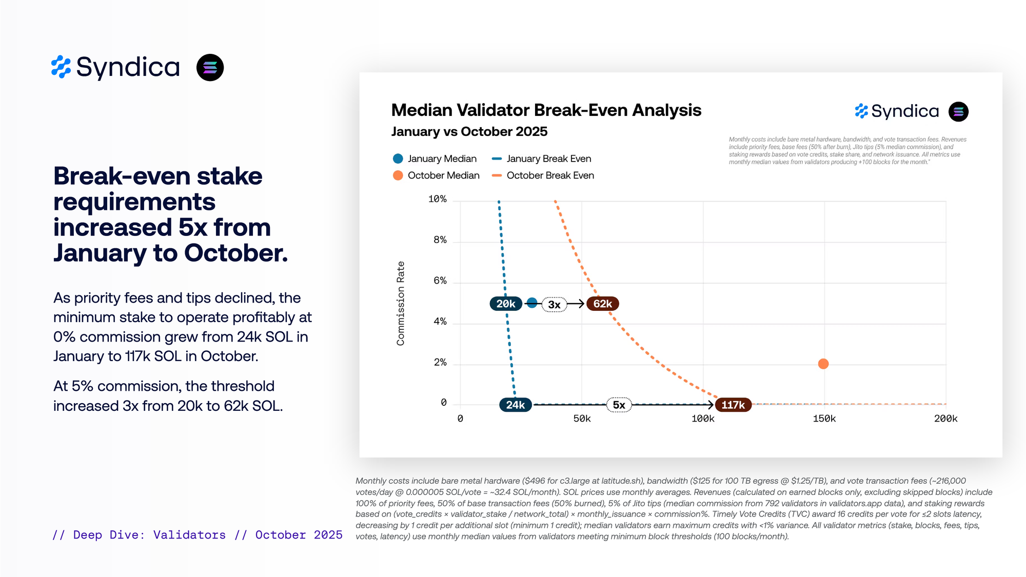 Break-even stake requirements increased 5x from January to October. As priority fees and tips declined, the minimum stake to operate profitably at 0% commission grew from 24k SOL in January to 117k SOL in October. At 5% commission, the threshold increased 3x from 20k to 62k SOL.