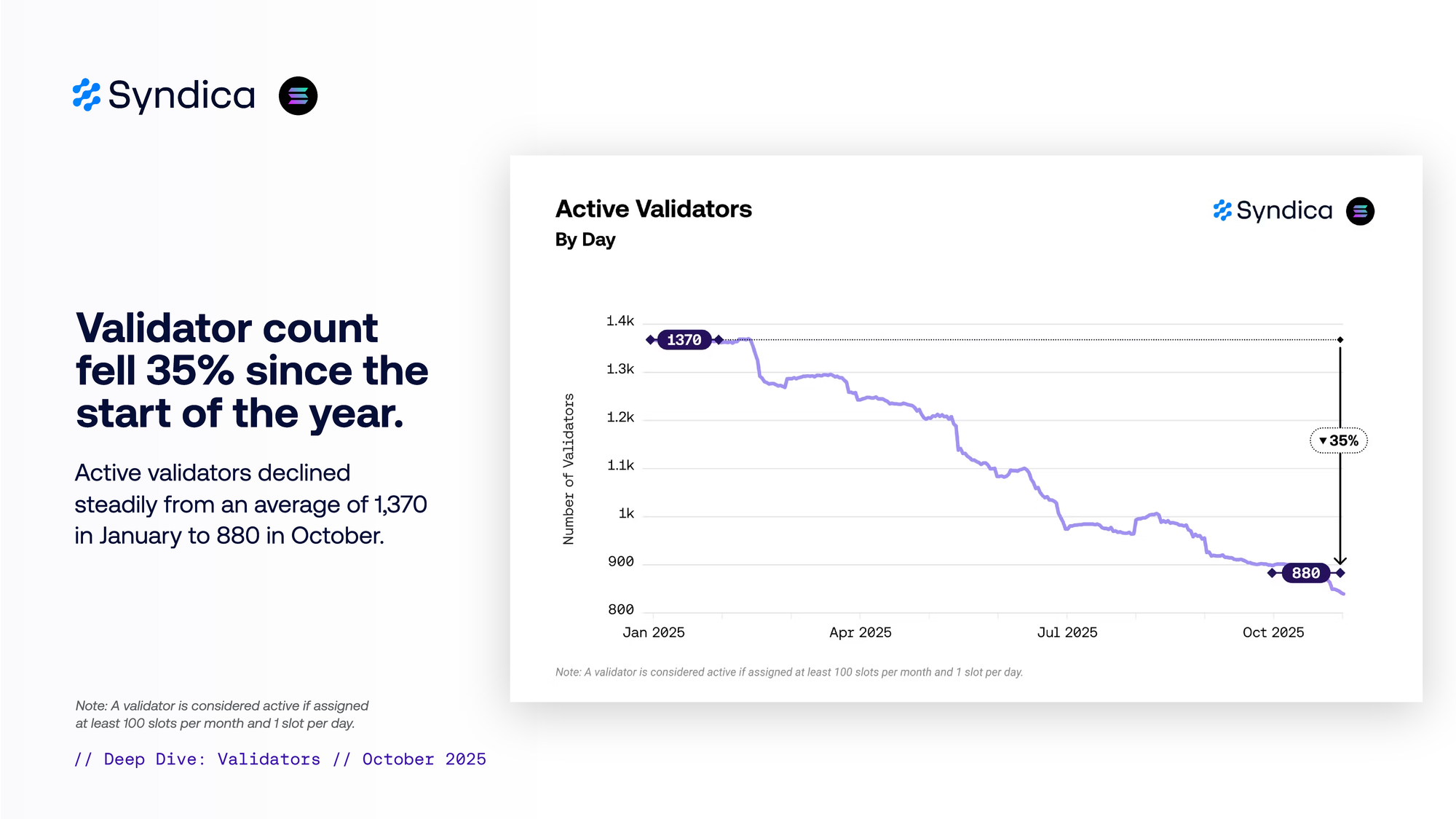 Validator count fell 35% since the start of the year. Active validators declined steadily from an average of 1,370 in January to 880 in October.