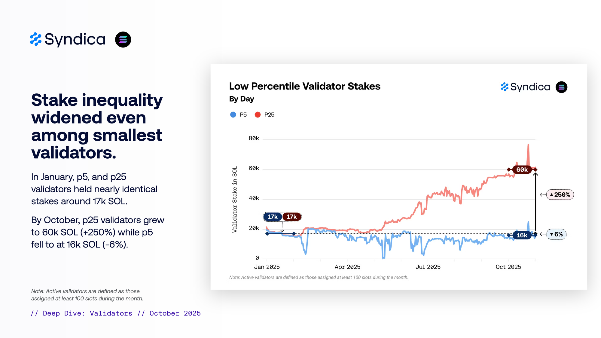 Stake inequality widened even among the smallest validators. In January, p5 and p25 validators held nearly identical stakes around 17k SOL. By October, p25 validators grew to 60k SOL (+250%) while p5 fell to at 16k SOL (-6%).