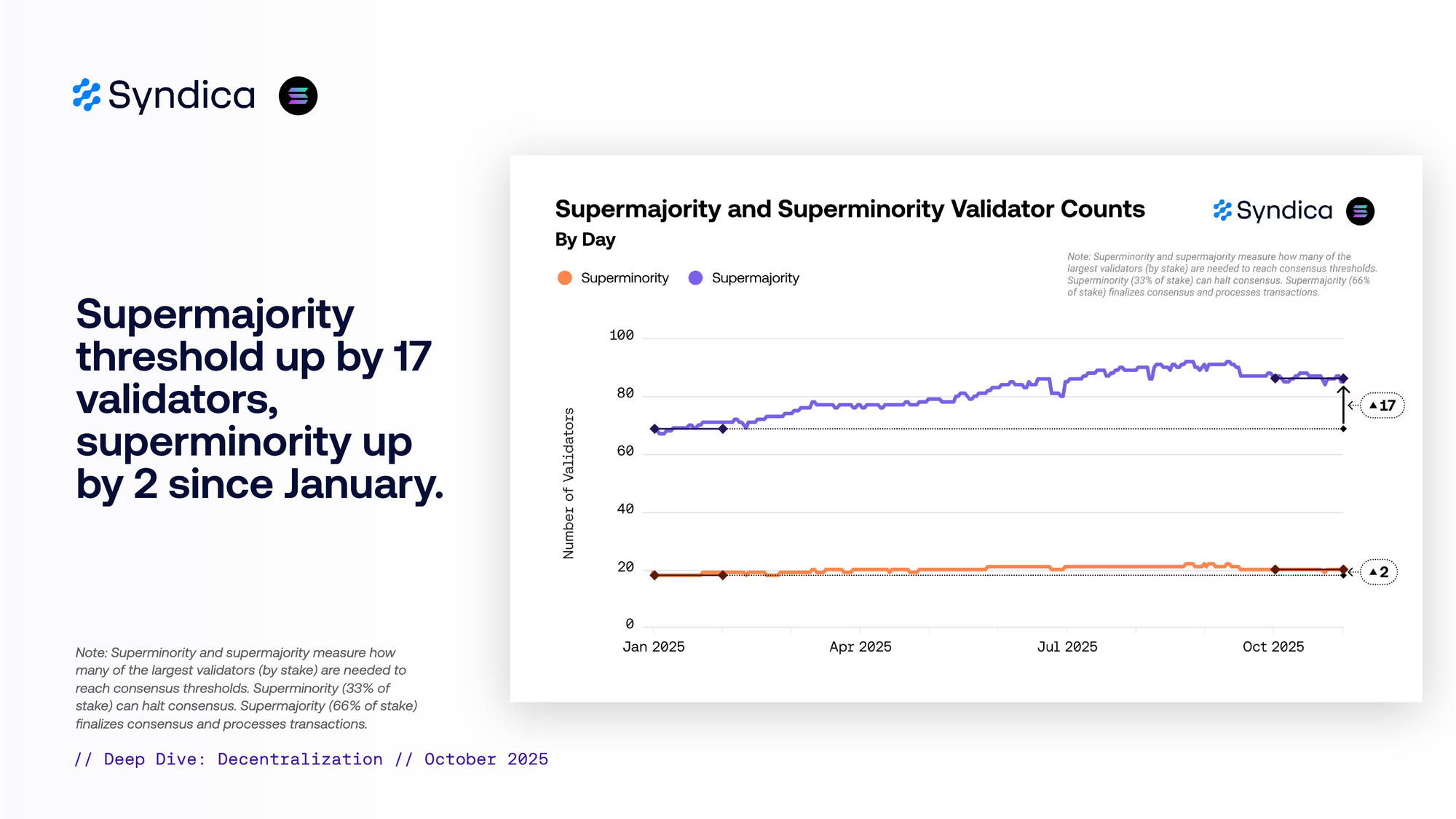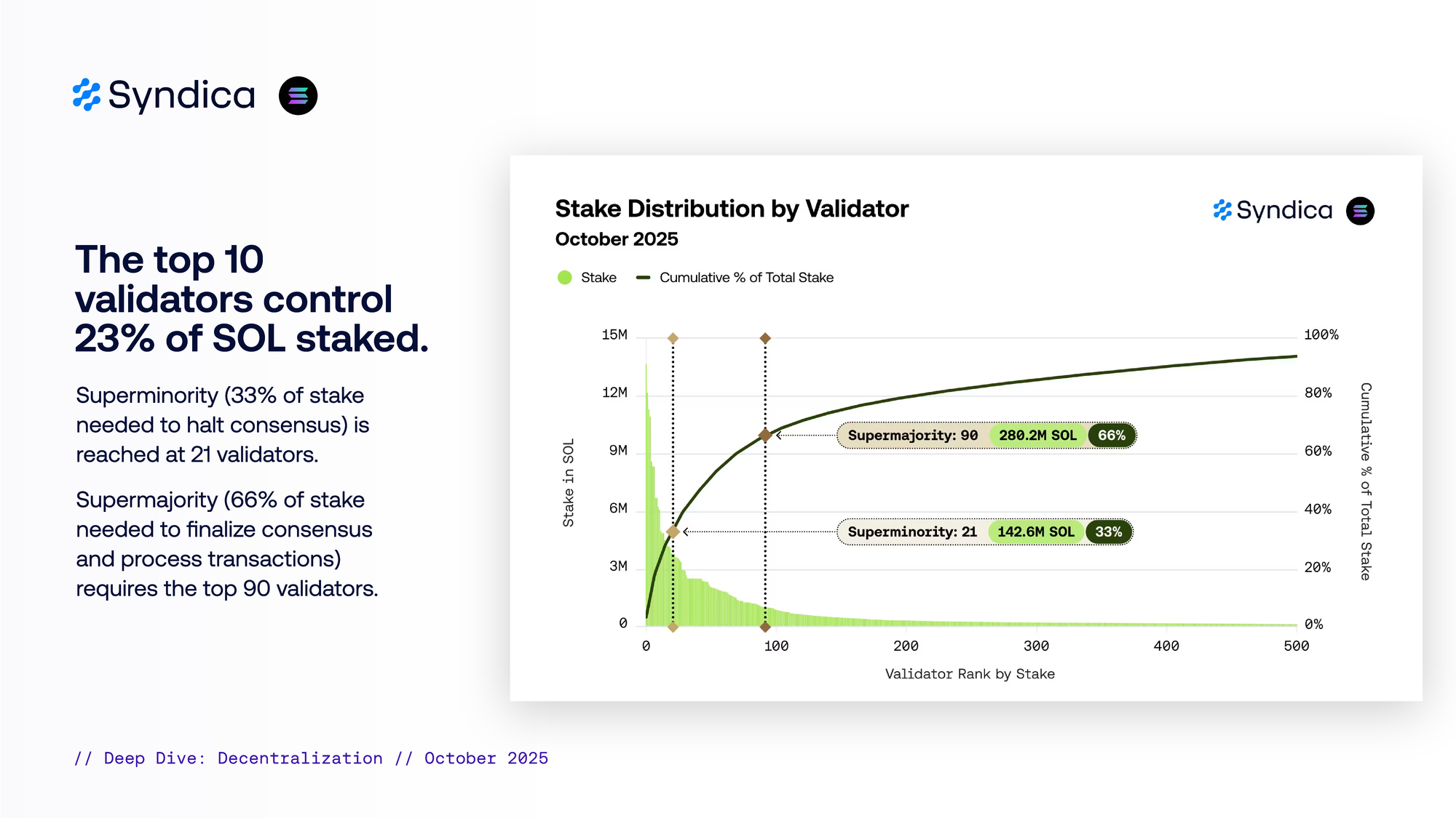 The top 10 validators controlled 23% of SOL staked. Superminority (33% of stake needed to halt consensus) is reached at 21 validators. Supermajority (66% of stake needed to finalize consensus and process transactions) required the top 90 validators.