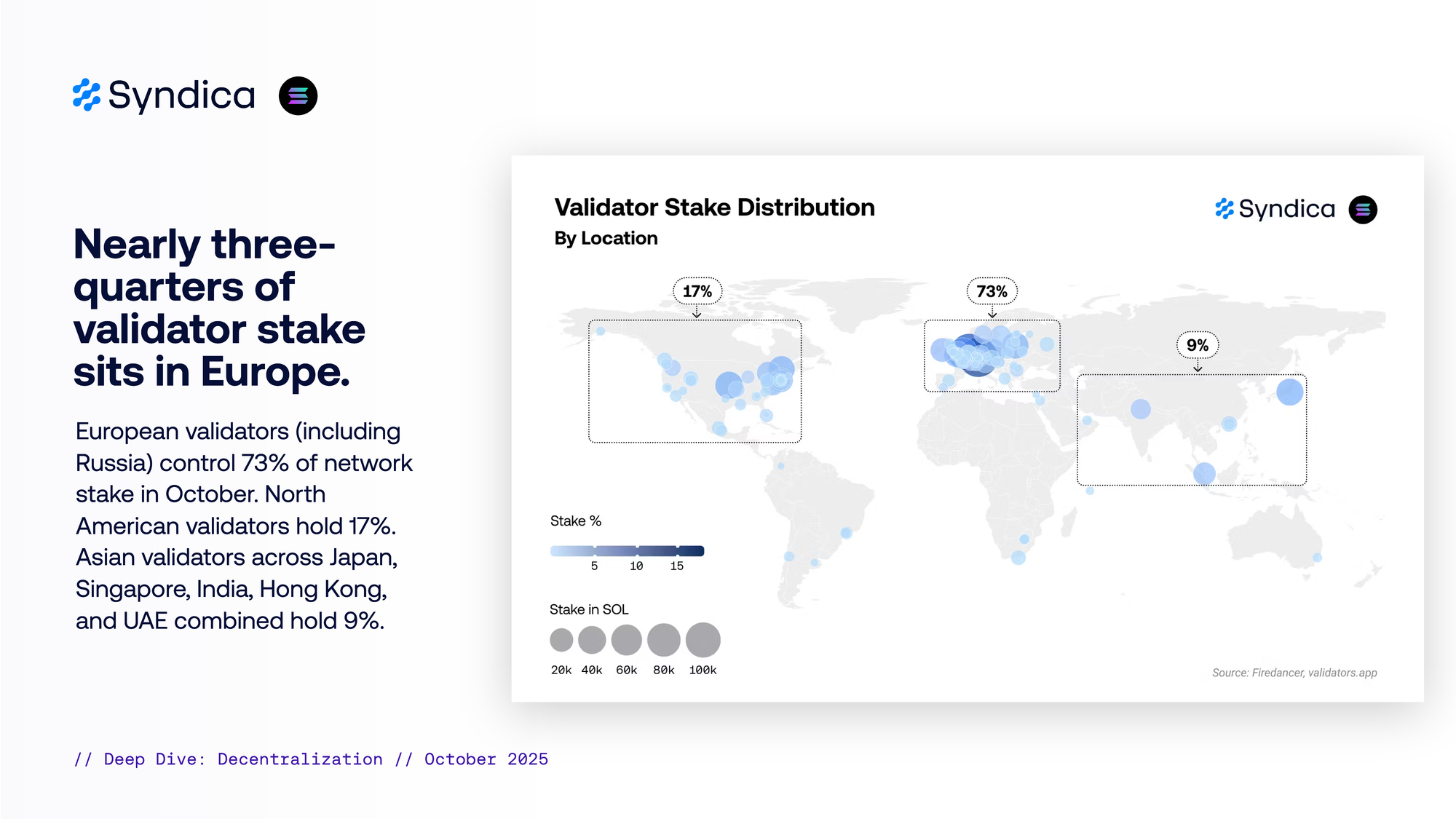 Nearly three-quarters of validator stake sits in Europe. European validators (including Russia) control 73% of network stake in October. North American validators hold 17%. Asian validators across Japan, Singapore, India, Hong Kong, and UAE combined hold 9%.