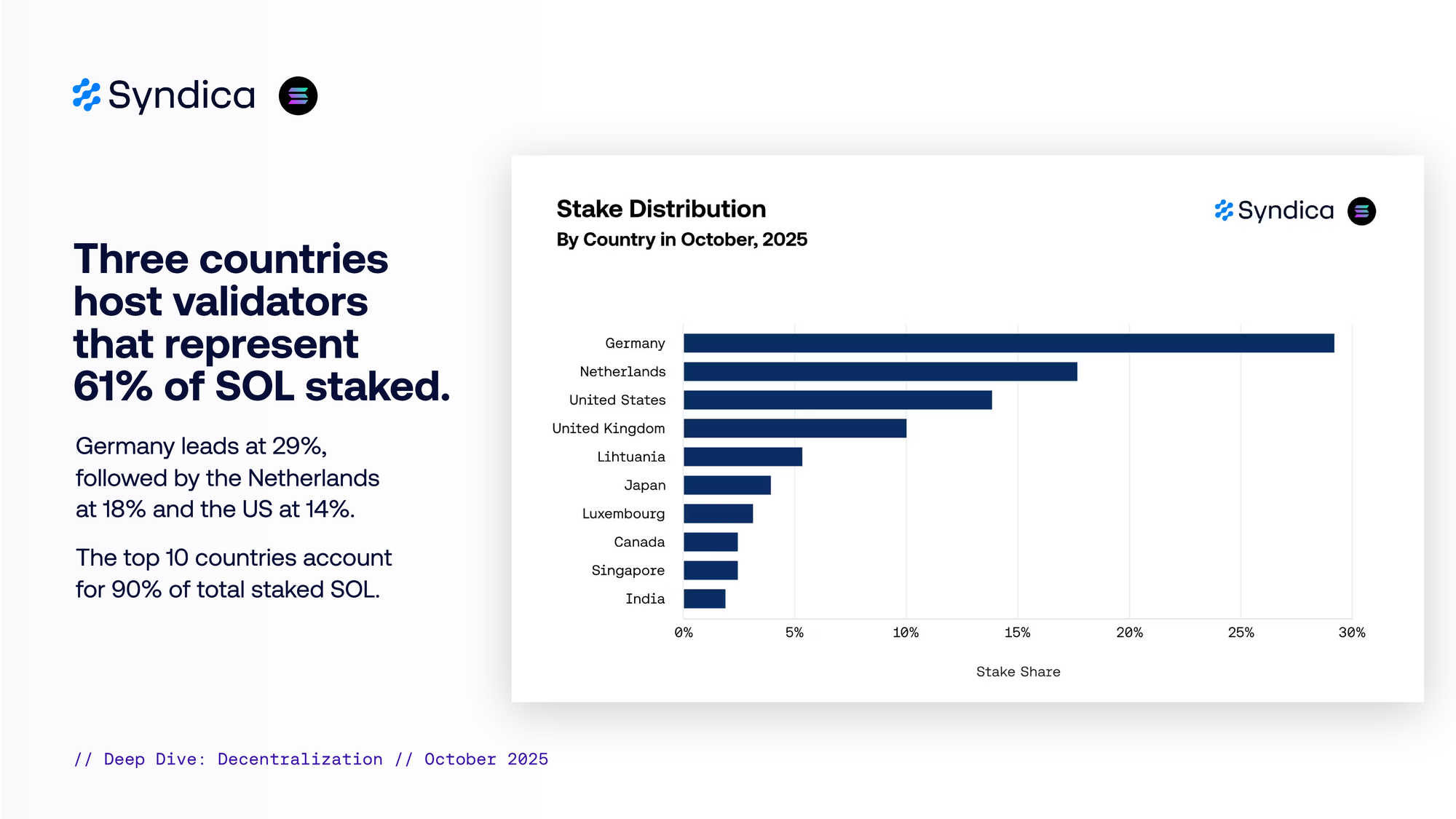 Three countries host validators that represent 61% of SOL staked. Germany leads at 29%, followed by the Netherlands at 18% and the US at 14%. The top 10 countries account for 90% of total staked SOL.