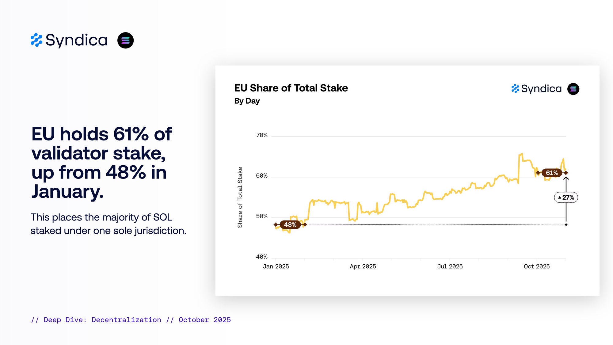 EU holds 61% of validator stake, up from 48% in January. This places the majority of SOL staked under one sole jurisdiction.