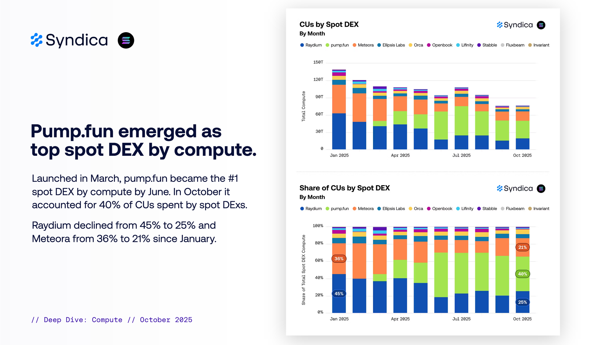 Pump.fun emerged as top spot DEX by compute. Launched in March, pump.fun became the #1 spot DEX by compute by June. In October it accounted for 40% of CUs spent by spot DExs. Raydium declined from 45% to 25% and Meteora from 36% to 21% since January.