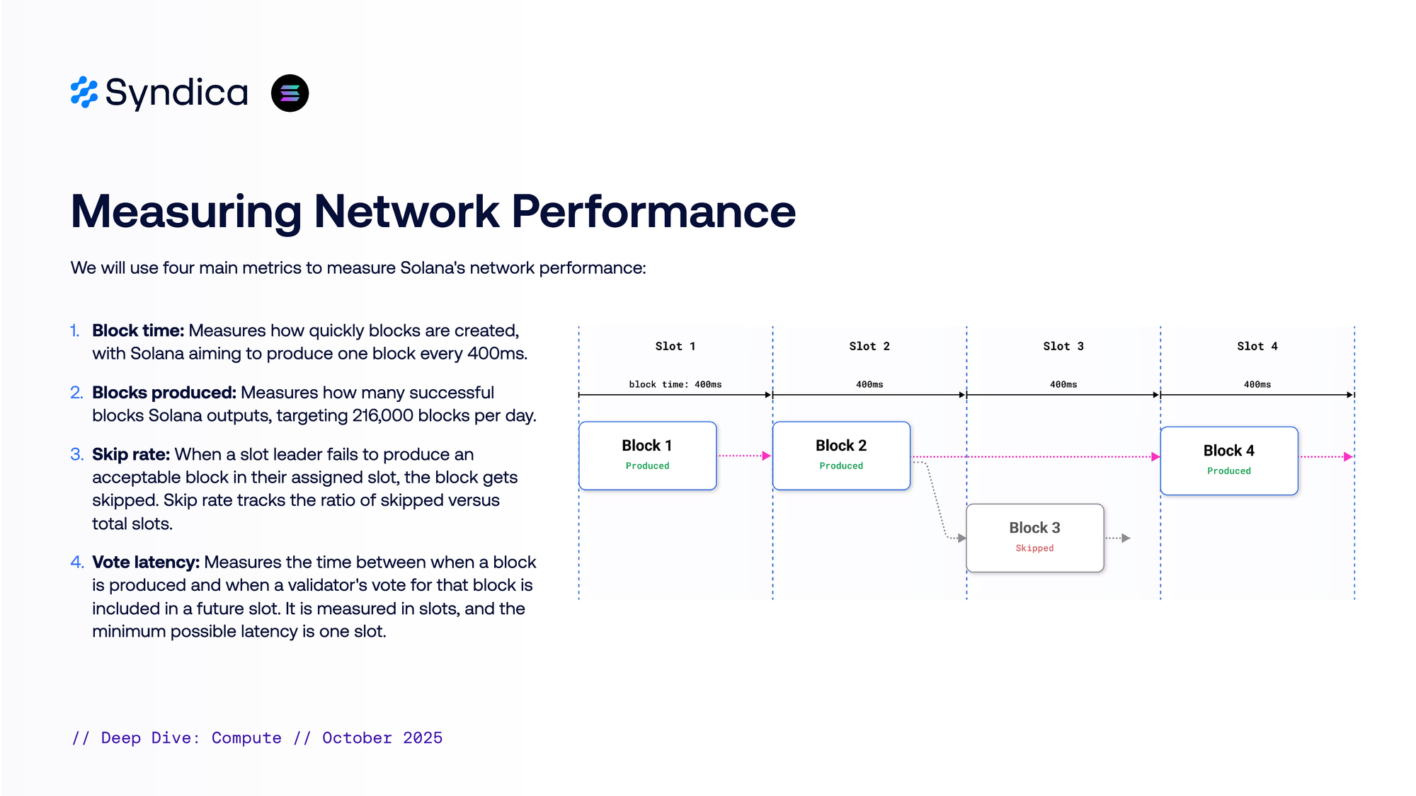 - Block time: Measures how quickly blocks are created, with Solana aiming to produce one block every 400ms.