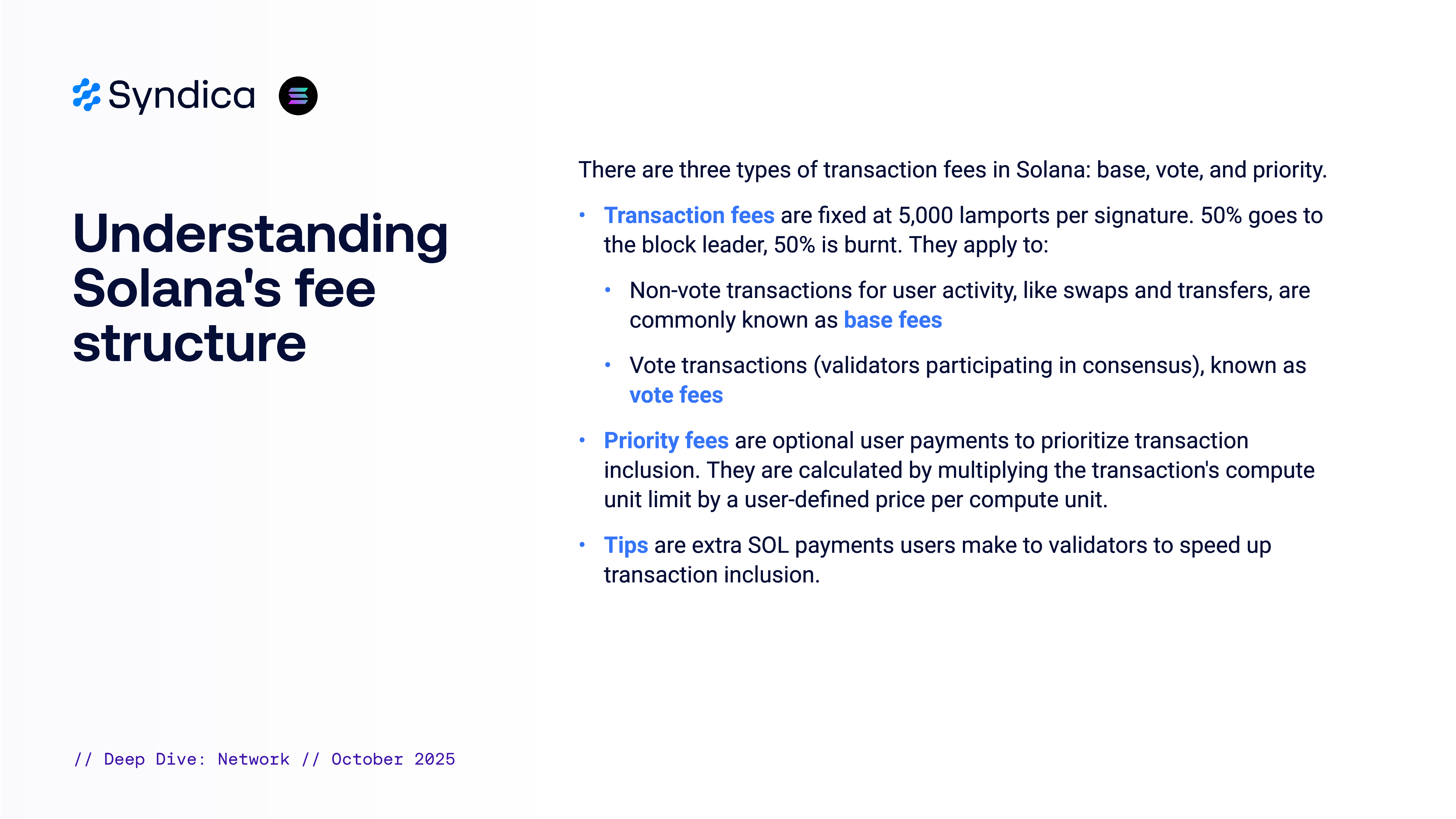 There are three types of transaction fees in Solana: base, vote, and priority.