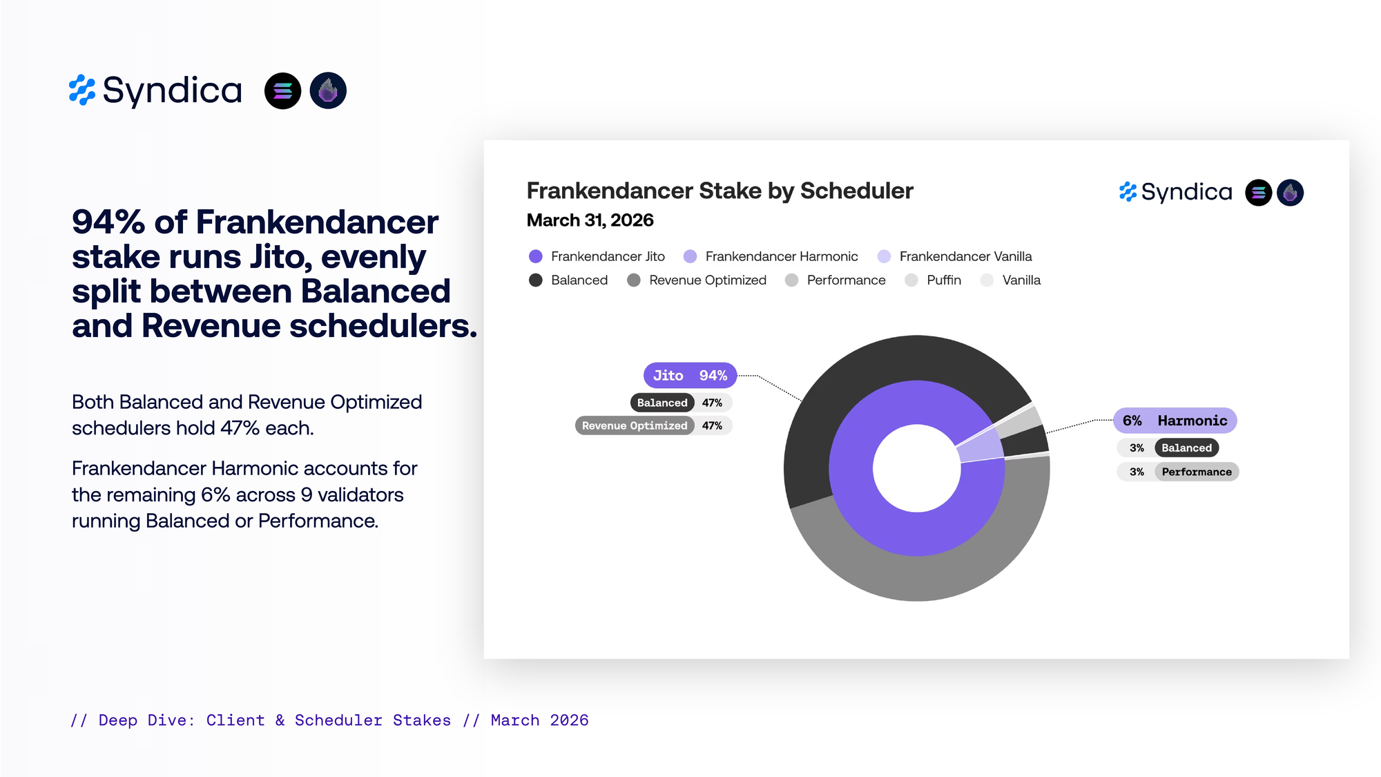94% of Frankendancer stake runs Jito, evenly split between Balanced and Revenue schedulers.