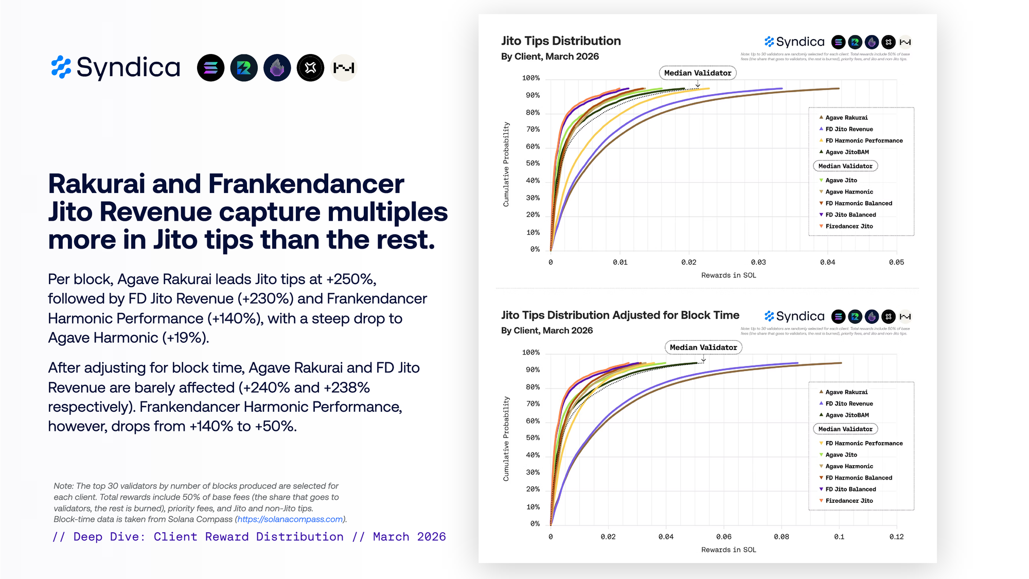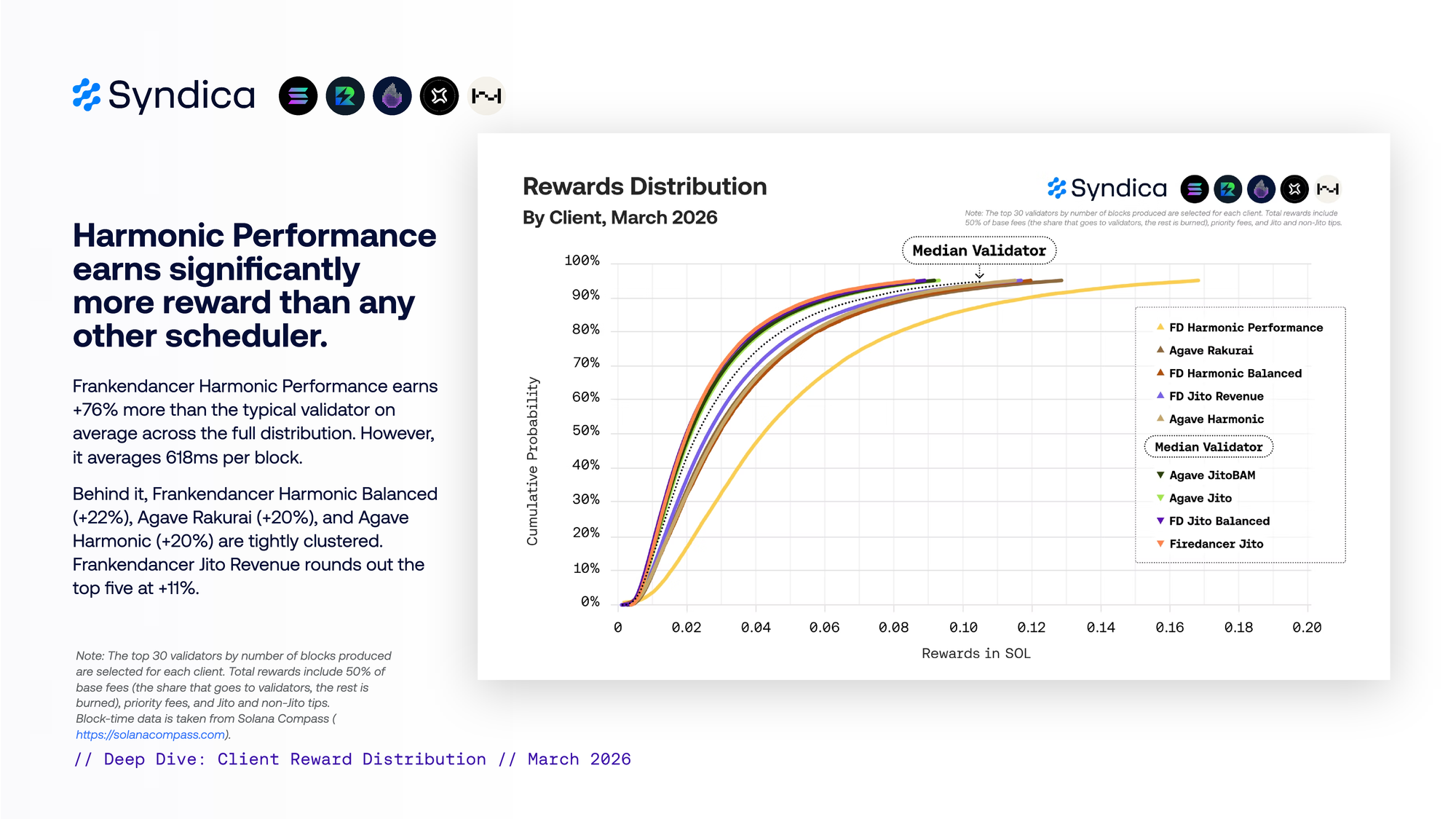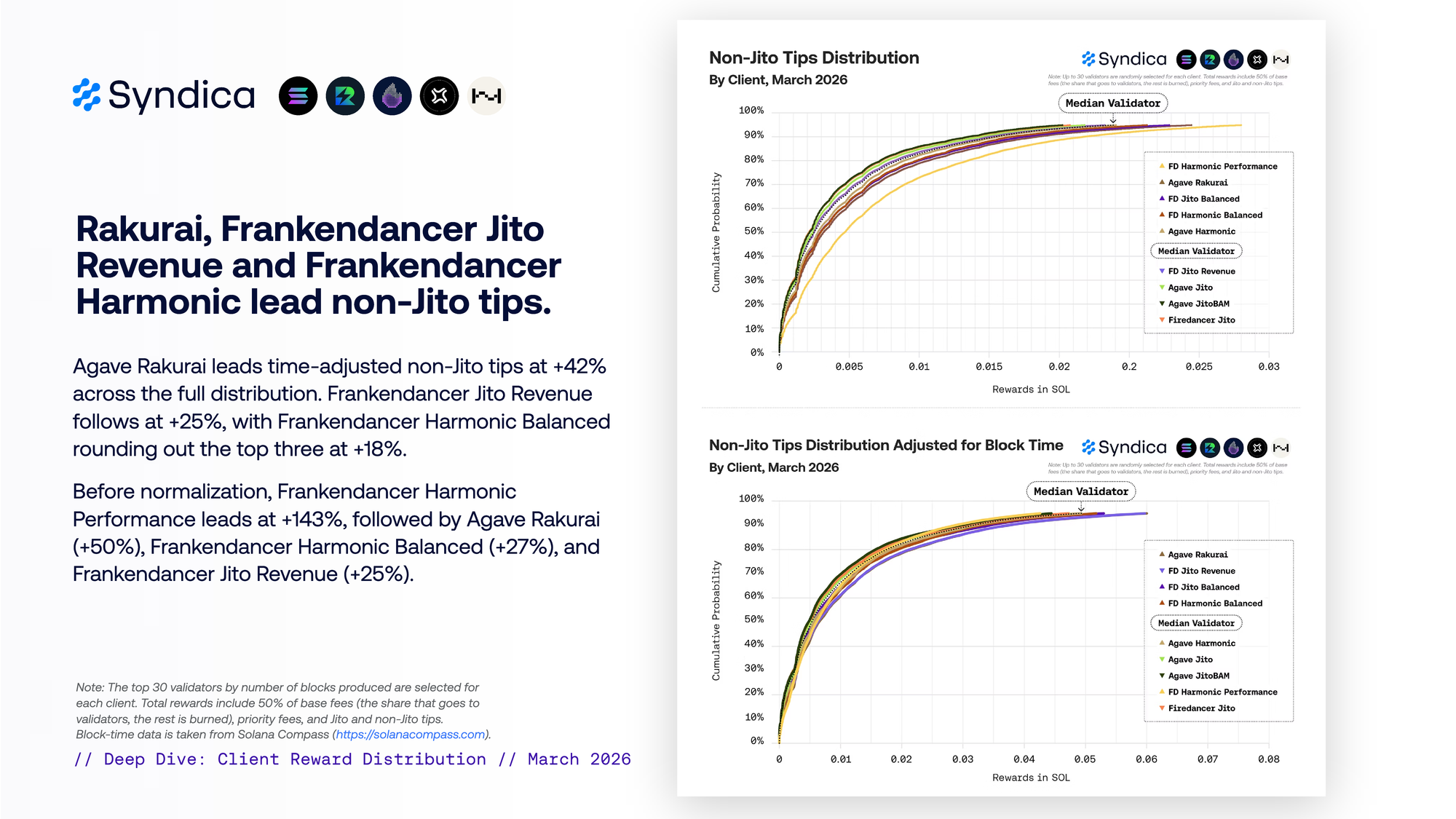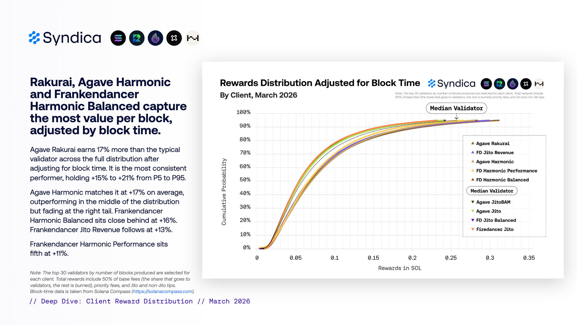 adjusted by block time. Agave Rakurai earns 17% more than the typical validator across the full distribution afer adjusting for block time. It is the most consistent performer, holding +15% to +21% from P5 to P95. Agave Harmonic matches it at +17% on average, outperforming in the middle of the distribution but fading at the right tail. Frankendancer Harmonic Balanced sits close behind at +16%. Frankendancer Jito Revenue follows at +13%. Frankendancer Harmonic Performance sits fifh at +11%.