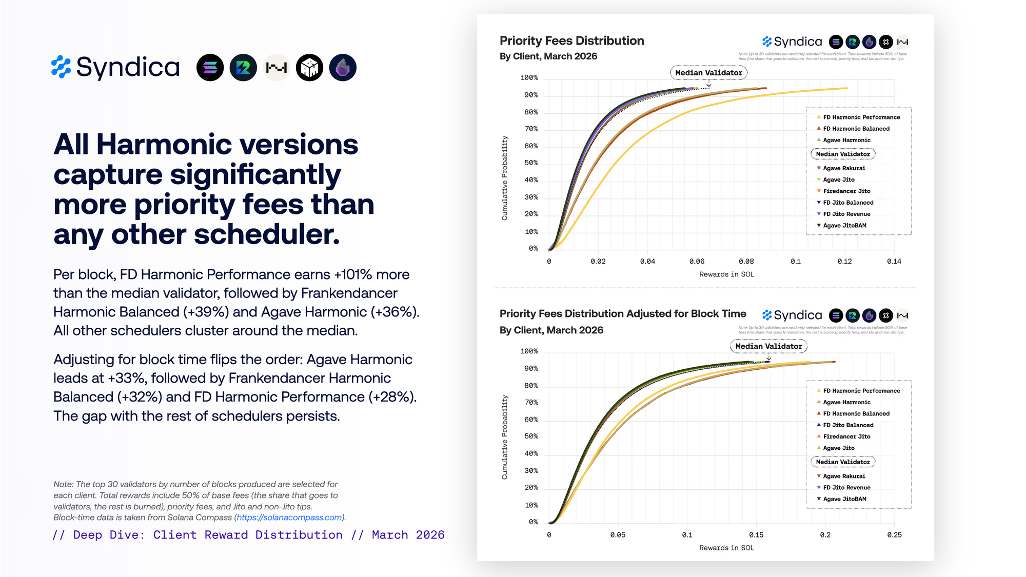 Per block, FD Harmonic Performance earns +101% more than the median validator, followed by Frankendancer Harmonic Balanced (+39%) and Agave Harmonic (+36%). All other schedulers cluster around the median. Adjusting for block time flips the order: Agave Harmonic leads at +33%, followed by Frankendancer Harmonic Balanced (+32%) and FD Harmonic Performance (+28%). The gap with the rest of schedulers persists.