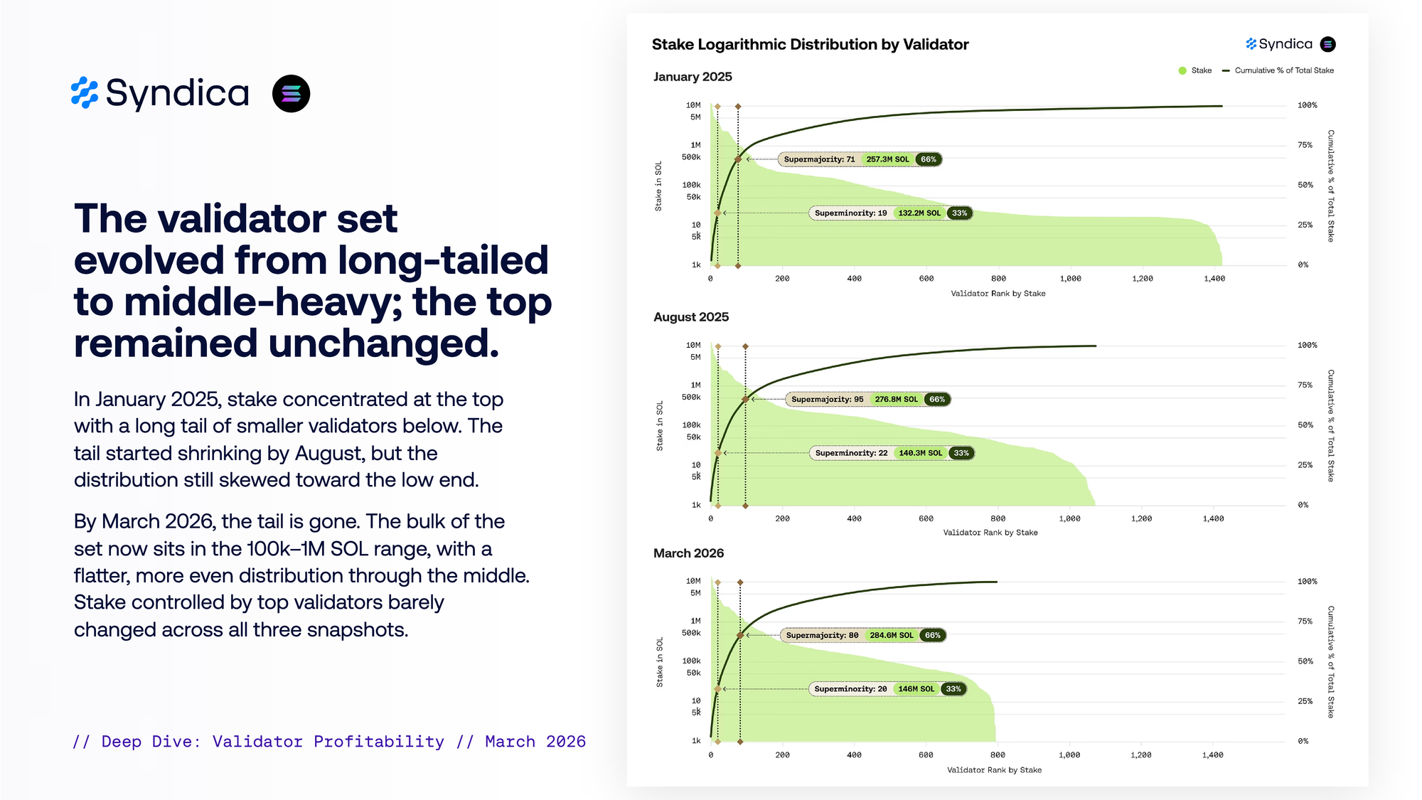 In January 2025, stake concentrated at the top with a long tail of smaller validators below. The tail started shrinking by August, but the distribution still skewed toward the low end. By March 2026, the tail is gone. The bulk of the set now sits in the 100k–1M SOL range, with a flafer, more even distribution through the middle. Stake controlled by top validators barely changed across all three snapshots.