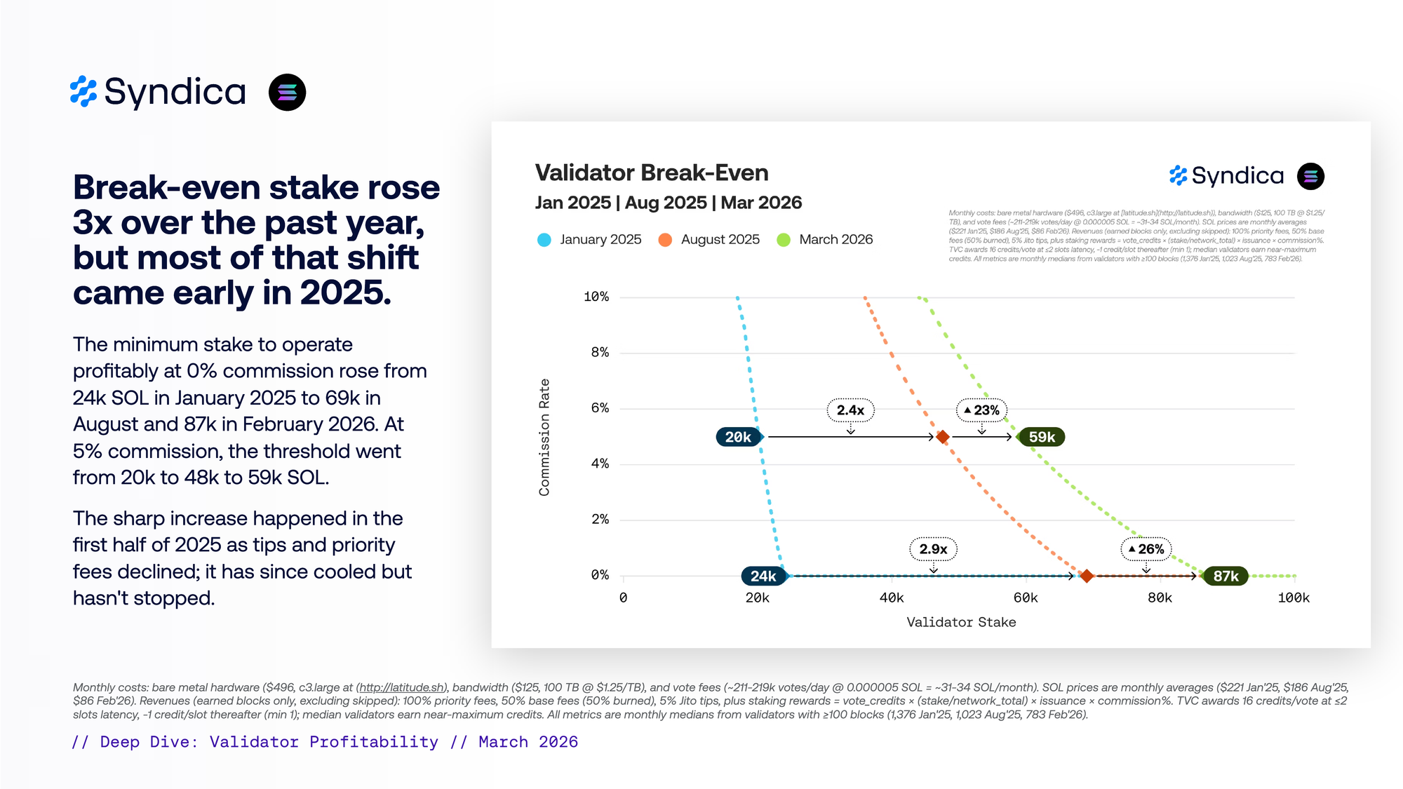 The minimum stake to operate profitably at 0% commission rose from 24k SOL in January 2025 to 69k in August and 87k in February 2026. At 5% commission, the threshold went from 20k to 48k to 59k SOL. The sharp increase happened in the first half of 2025 as tips and priority fees declined; it has since cooled but hasn't stopped.