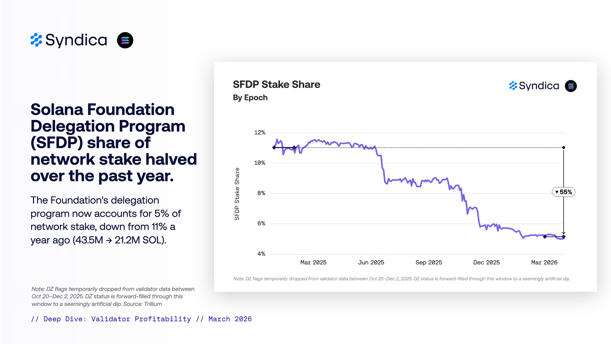 over the past year. The Foundation's delegation program now accounts for 5% of network stake, down from 11% a year ago (43.5M → 21.2M SOL).