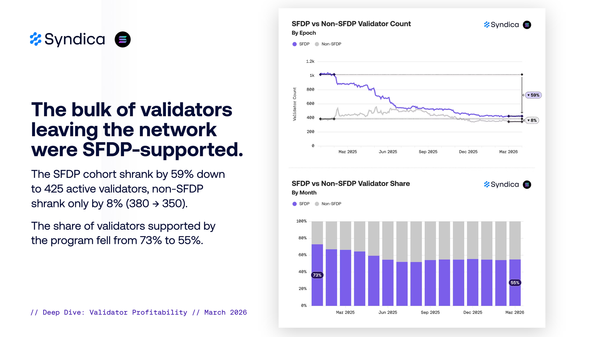 The SFDP cohort shrank by 59% down to 425 active validators, non-SFDP shrank only by 8% (380 → 350). The share of validators supported by the program fell from 73% to 55%.