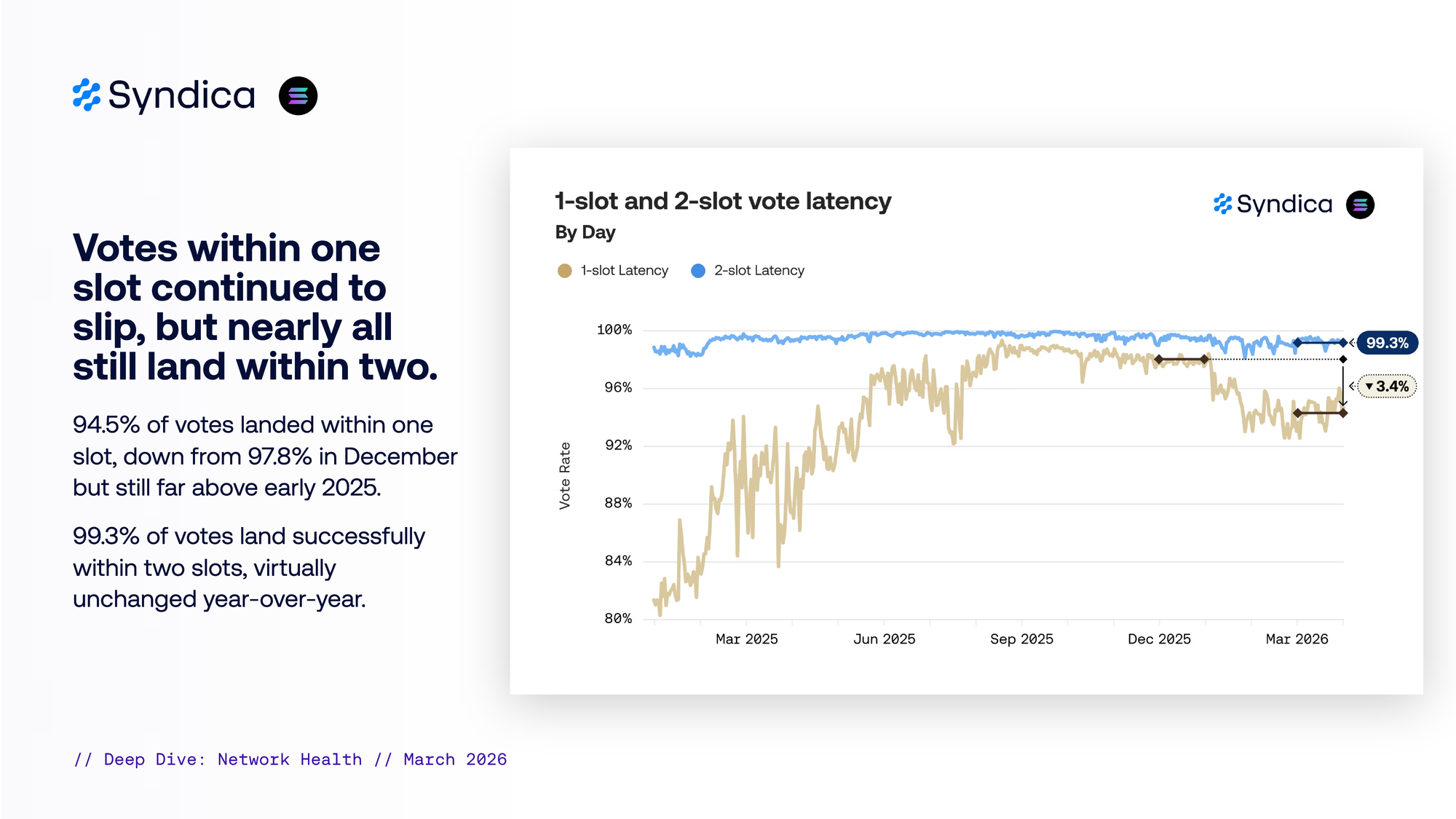 94.5% of votes landed within one slot, down from 97.8% in December but still far above early 2025. 99.3% of votes land successfully within two slots, virtually unchanged year-over-year.