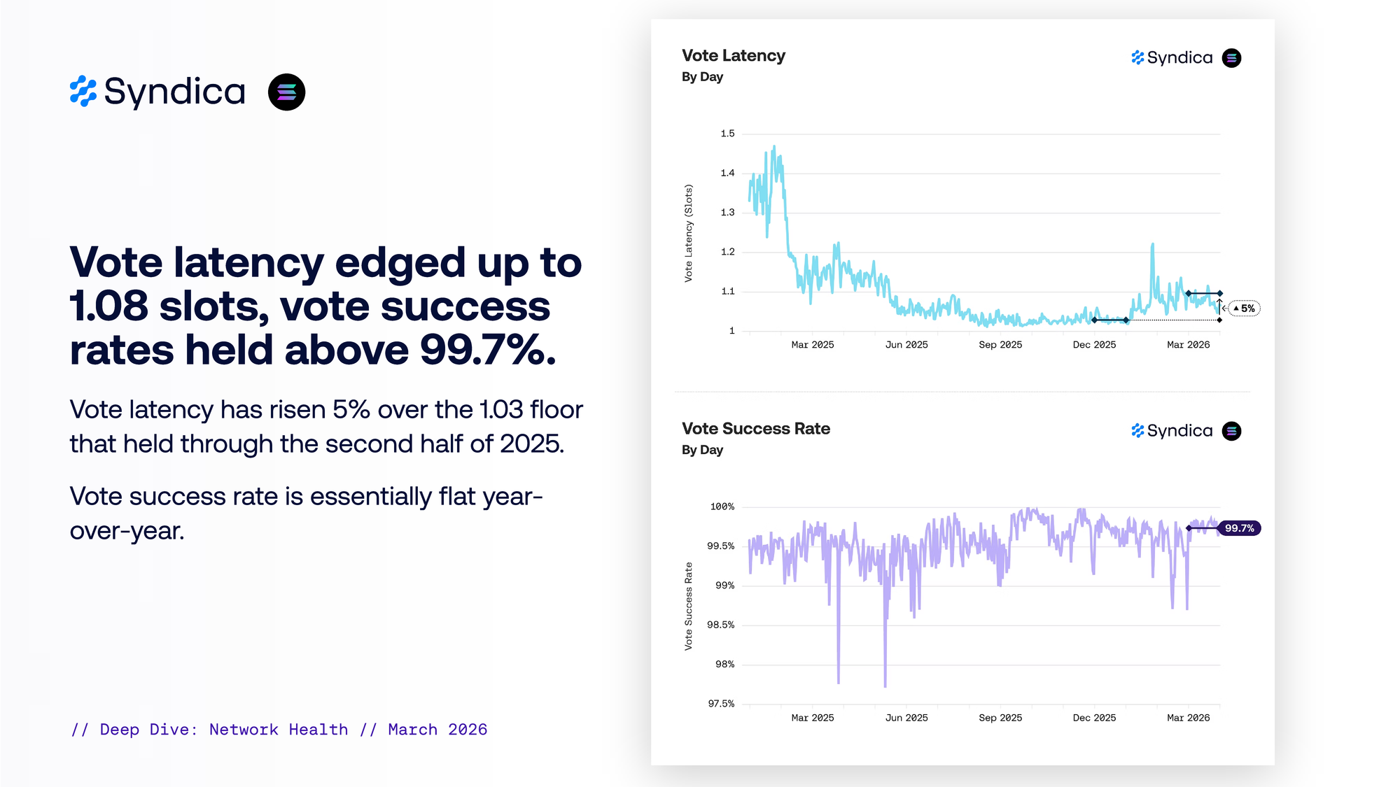 Vote latency has risen 5% over the 1.03 floor that held through the second half of 2025. Vote success rate is essentially flat year- over-year.