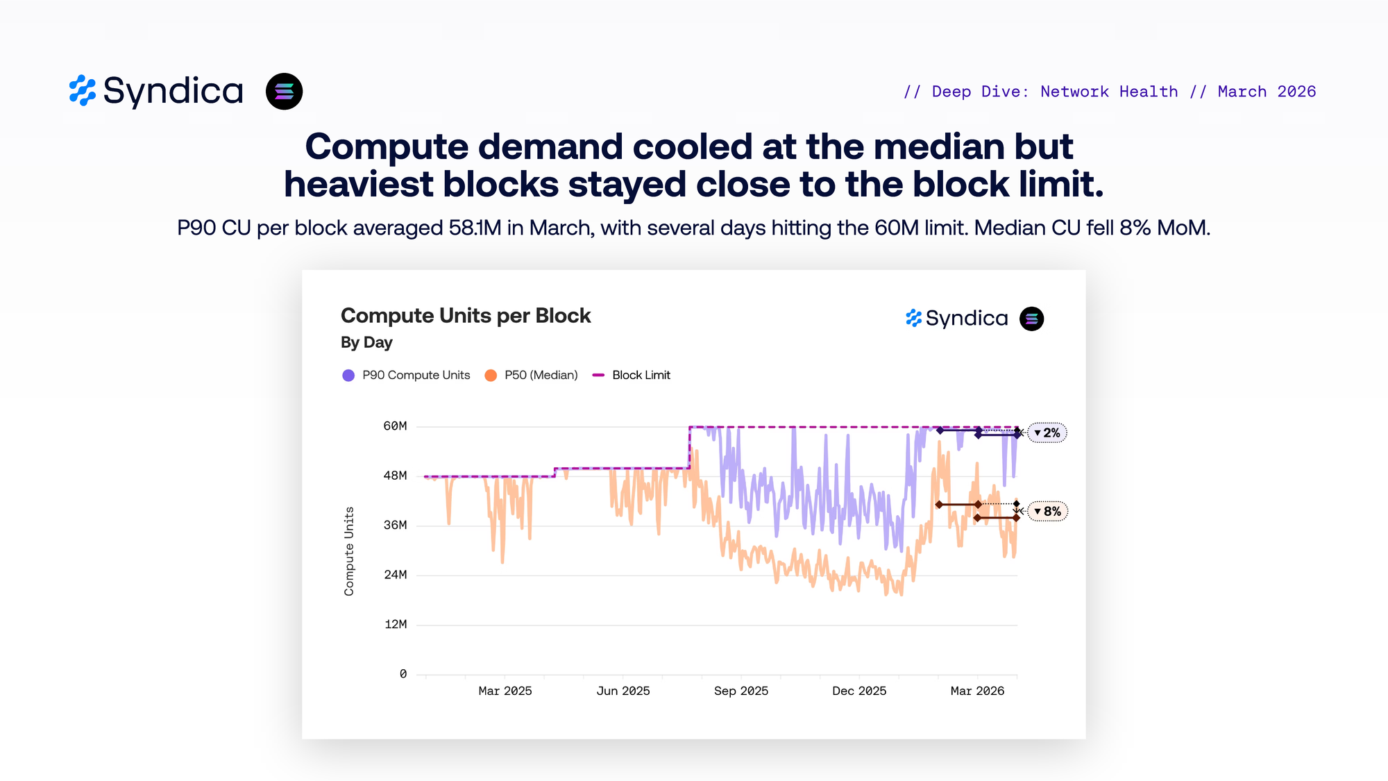Compute demand cooled at the median but heaviest blocks stayed close to the block limit. P90 CU per block averaged 58.1M in March, with several days hifing the 60M limit. Median CU fell 8% MoM.