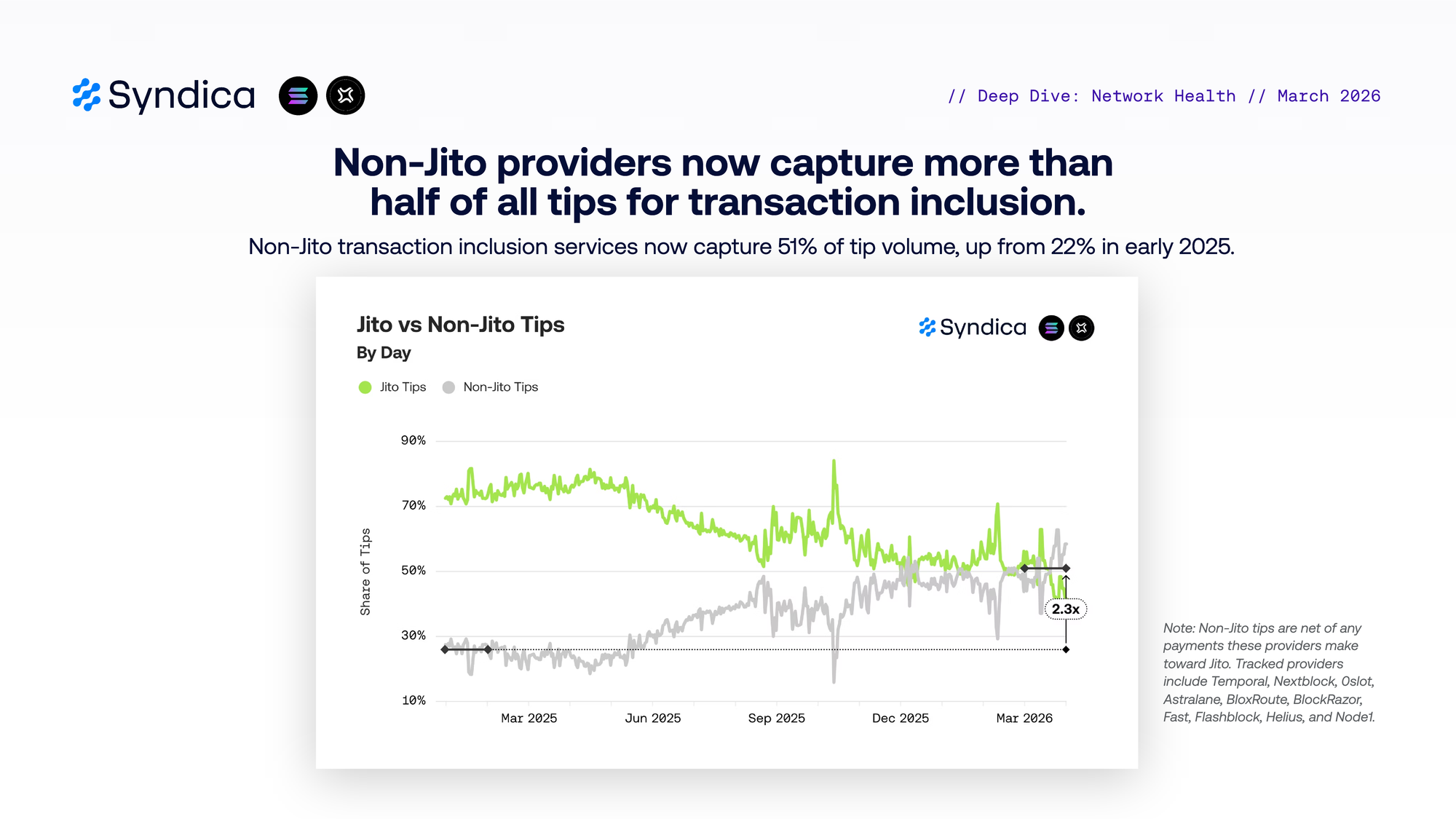 Non-Jito providers now capture more than half of all tips for transaction inclusion. Non-Jito transaction inclusion services now capture 51% of tip volume, up from 22% in early 2025.