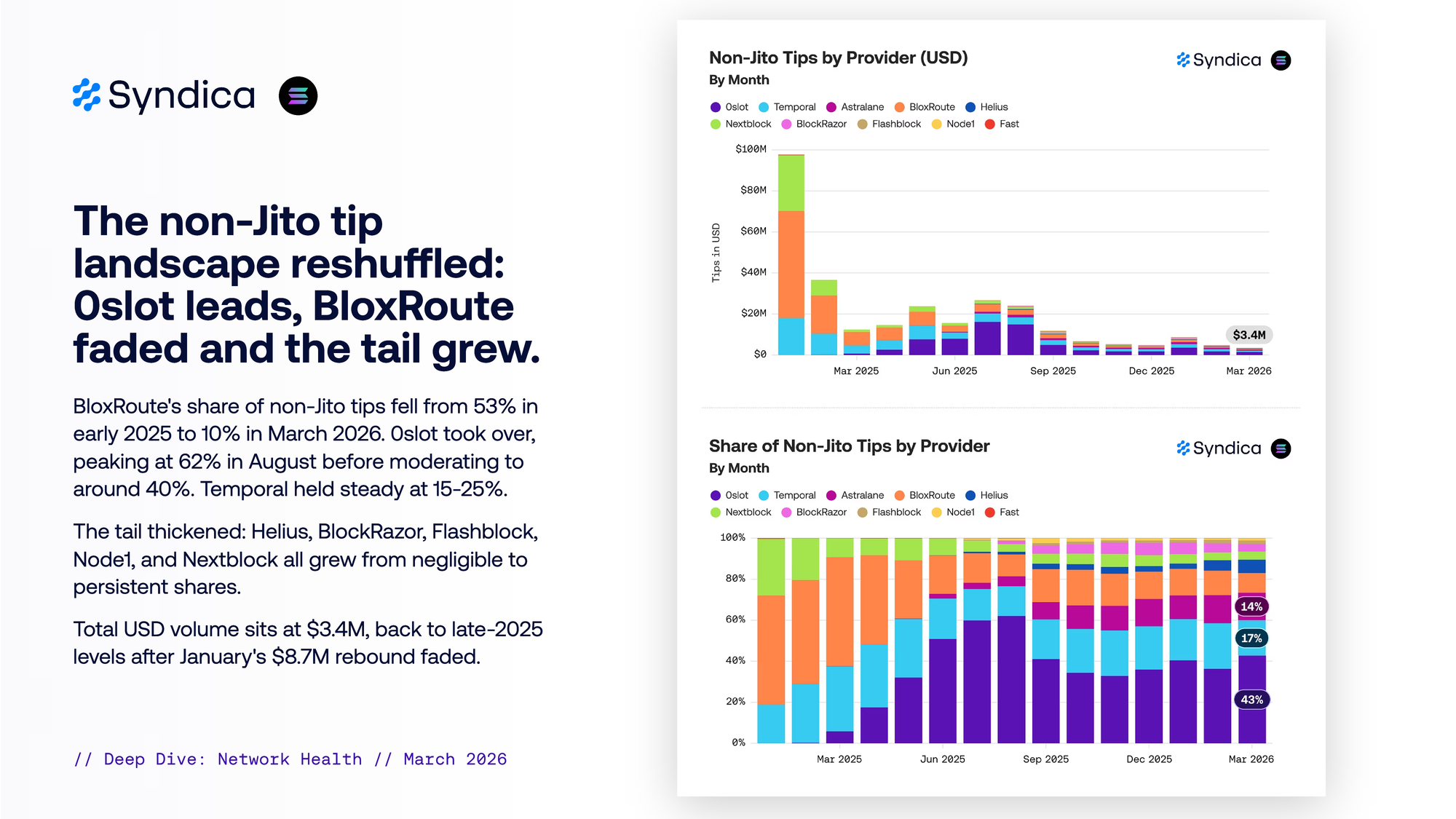 0slot leads, BloxRoute faded and the tail grew. BloxRoute's share of non-Jito tips fell from 53% in early 2025 to 10% in March 2026. 0slot took over, peaking at 62% in August before moderating to around 40%. Temporal held steady at 15-25%. The tail thickened: Helius, BlockRazor, Flashblock, Node1, and Nextblock all grew from negligible to persistent shares. Total USD volume sits at $3.4M, back to late-2025 levels afer January's $8.7M rebound faded.