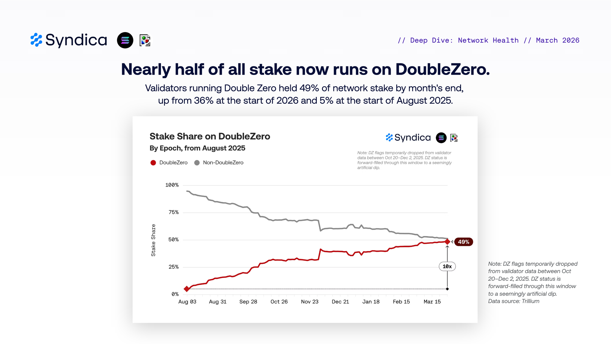 Nearly half of all stake now runs on DoubleZero. Validators running Double Zero held 49% of network stake by month's end, up from 36% at the start of 2026 and 5% at the start of August 2025.