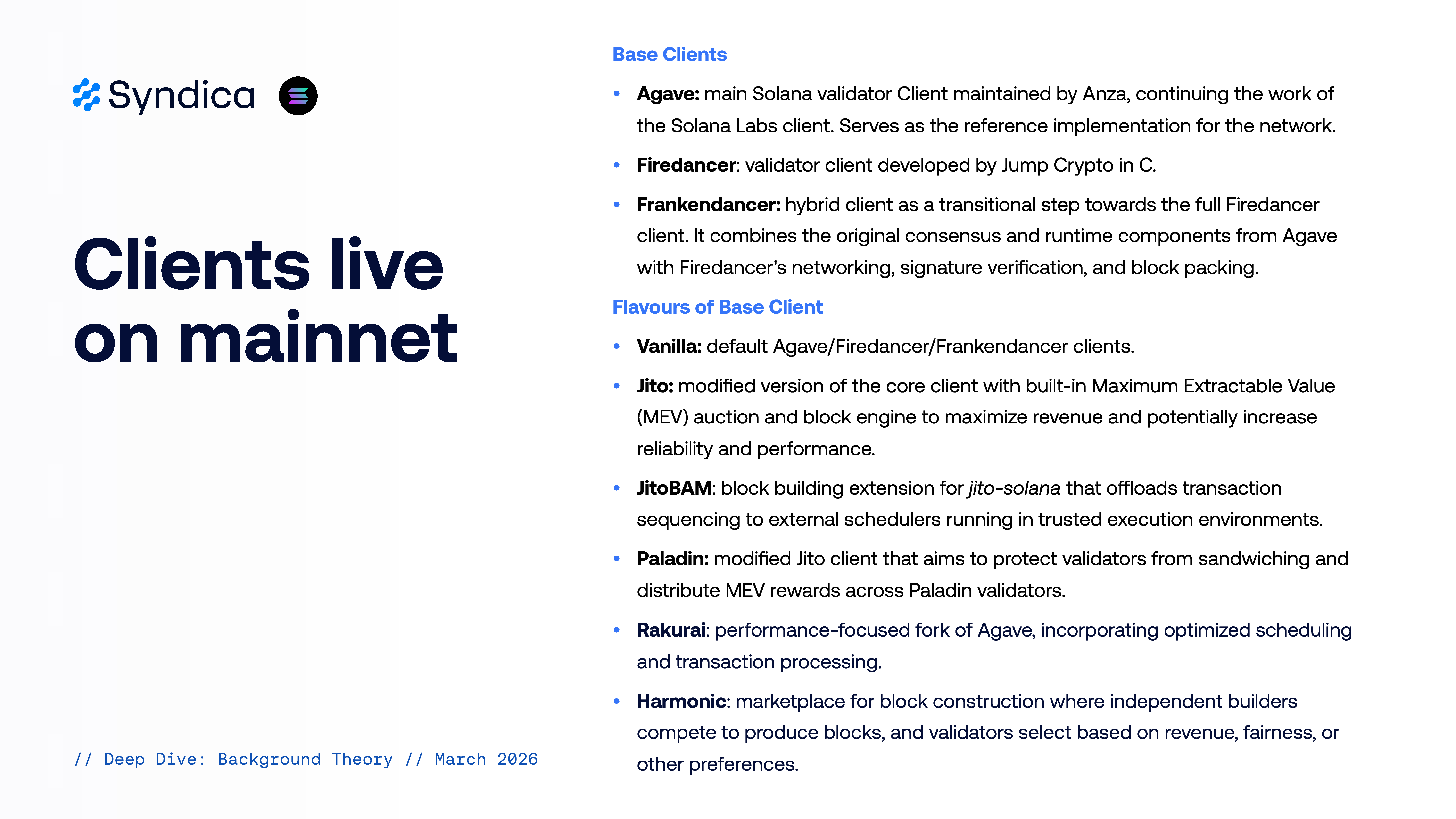 • Firedancer: validator client developed by Jump Crypto in C. • Frankendancer: hybrid client as a transitional step towards the full Firedancer Clients live client. It combines the original consensus and runtime components from Agave with Firedancer's networking, signature verification, and block packing. on mainnet Flavours of Base Client • Vanilla: default Agave/Firedancer/Frankendancer clients. • Jito: modified version of the core client with built-in Maximum Extractable Value (MEV) auction and block engine to maximize revenue and potentially increase reliability and performance. • JitoBAM: block building extension for jito-solana that ofloads transaction sequencing to external schedulers running in trusted execution environments. • Paladin: modified Jito client that aims to protect validators from sandwiching and distribute MEV rewards across Paladin validators. • Rakurai: performance-focused fork of Agave, incorporating optimized scheduling and transaction processing. • Harmonic: marketplace for block construction where independent builders compete to produce blocks, and validators select based on revenue, fairness, or other preferences.