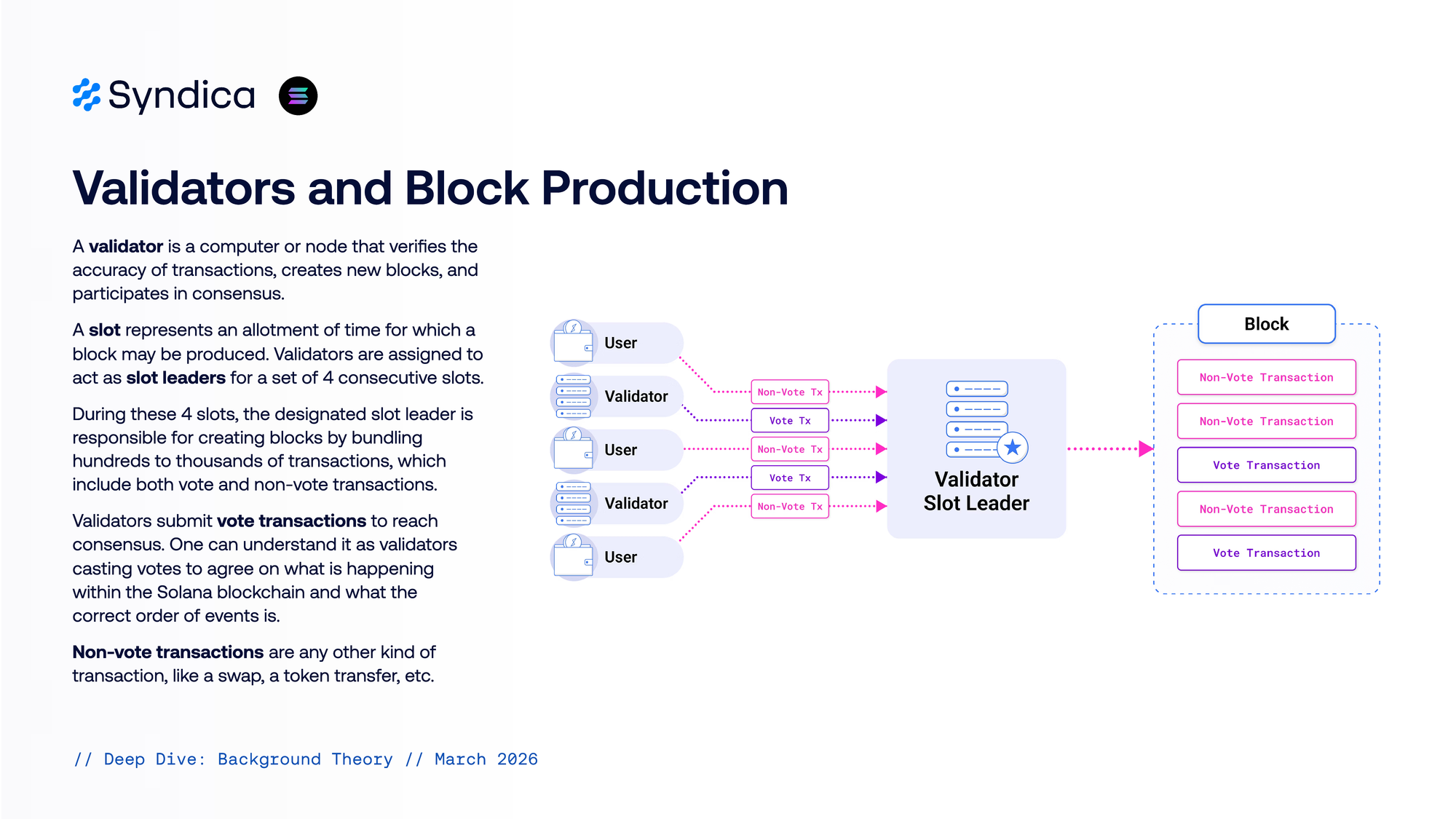 A slot represents an allotment of time for which a block may be produced. Validators are assigned to act as slot leaders for a set of 4 consecutive slots. During these 4 slots, the designated slot leader is responsible for creating blocks by bundling hundreds to thousands of transactions, which include both vote and non-vote transactions. Validators submit vote transactions to reach consensus. One can understand it as validators casting votes to agree on what is happening within the Solana blockchain and what the correct order of events is. Non-vote transactions are any other kind of transaction, like a swap, a token transfer, etc.