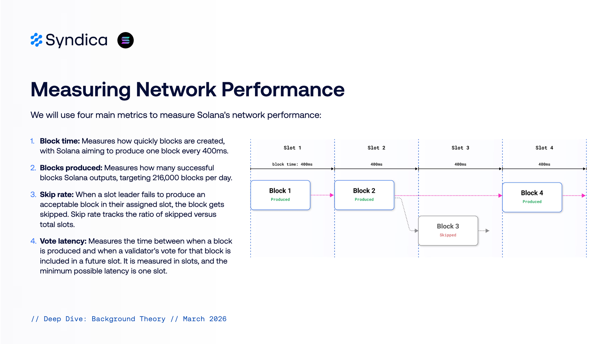 - Block time: Measures how quickly blocks are created, with Solana aiming to produce one block every 400ms. 2. Blocks produced: Measures how many successful blocks Solana outputs, targeting 216,000 blocks per day. 3. Skip rate: When a slot leader fails to produce an acceptable block in their assigned slot, the block gets skipped. Skip rate tracks the ratio of skipped versus total slots. 4. Vote latency: Measures the time between when a block is produced and when a validator's vote for that block is included in a future slot. It is measured in slots, and the minimum possible latency is one slot.