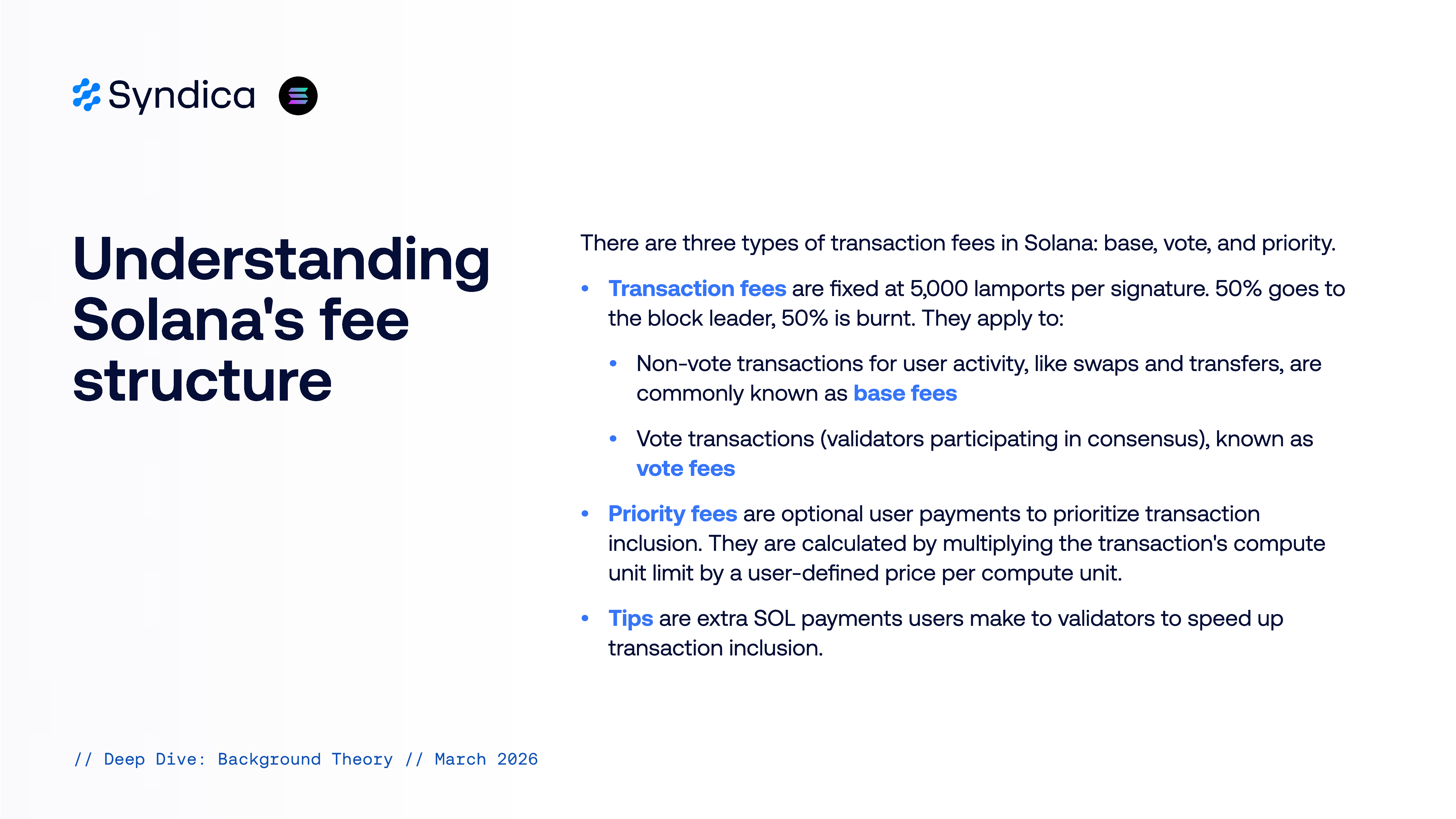 Understanding There are three types of transaction fees in Solana: base, vote, and priority.