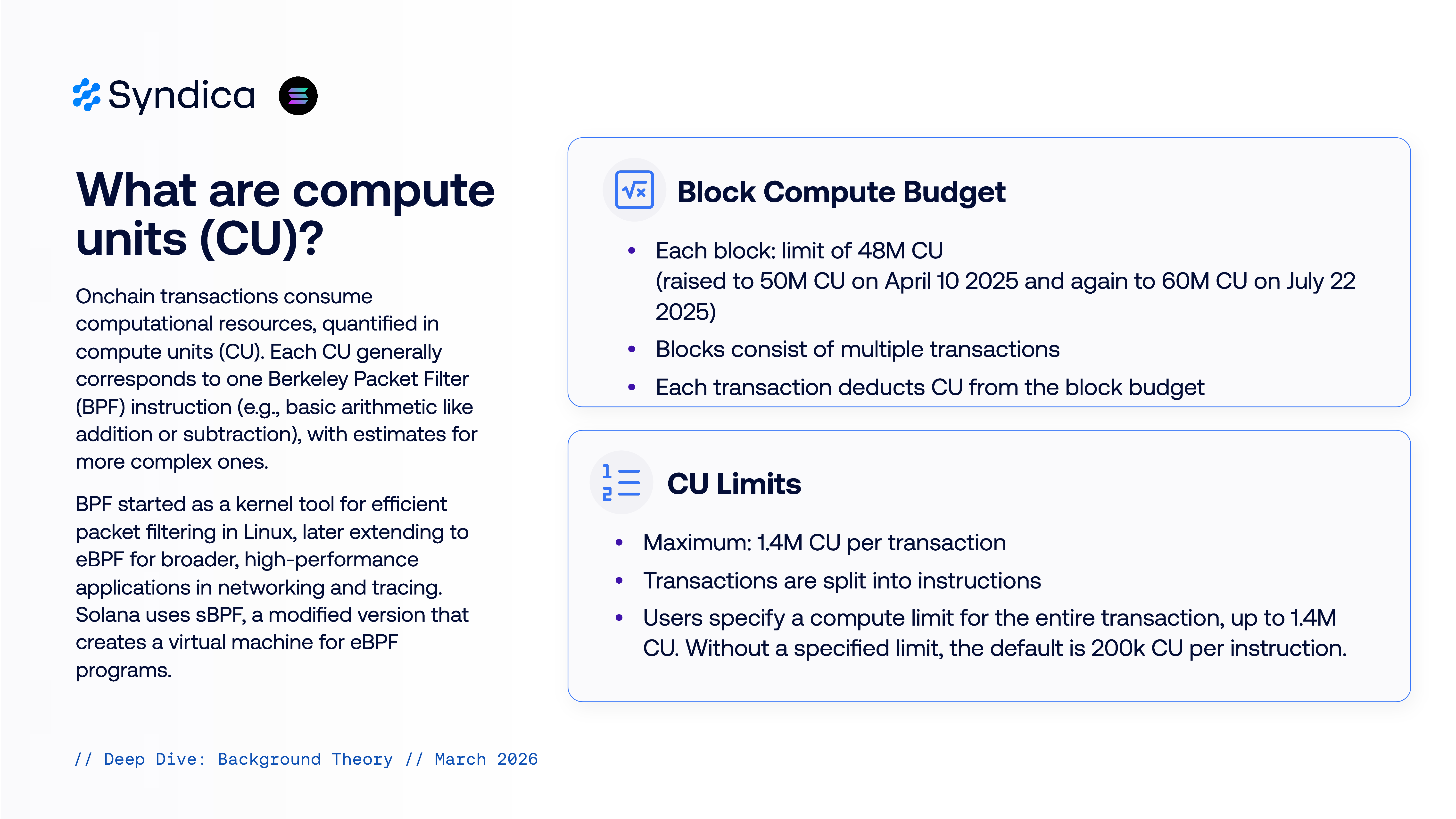• Blocks consist of multiple transactions compute units (CU). Each CU generally corresponds to one Berkeley Packet Filter