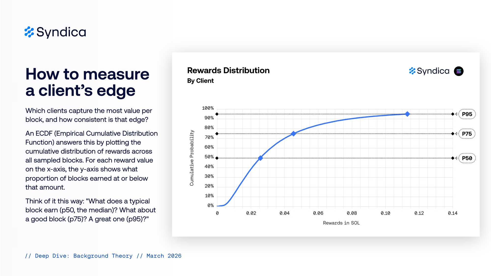 An ECDF (Empirical Cumulative Distribution Function) answers this by plofing the cumulative distribution of rewards across all sampled blocks. For each reward value on the x-axis, the y-axis shows what proportion of blocks earned at or below that amount. Think of it this way: "What does a typical block earn (p50, the median)? What about a good block (p75)? A great one (p95)?"