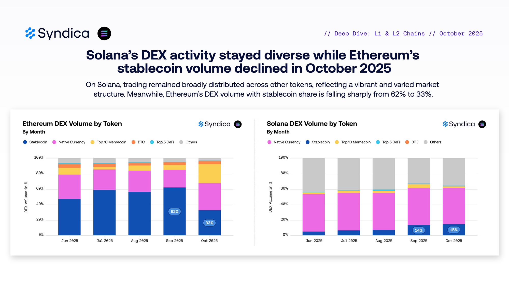 Solana’s DEX activity stayed diverse while Ethereum’s stablecoin volume declined in October 2025. On Solana, trading remained broadly distributed across other tokens, reflecting a vibrant and varied market structure. Meanwhile, Ethereum’s DEX volume with stablecoin share is falling sharply from 62% to 33%.